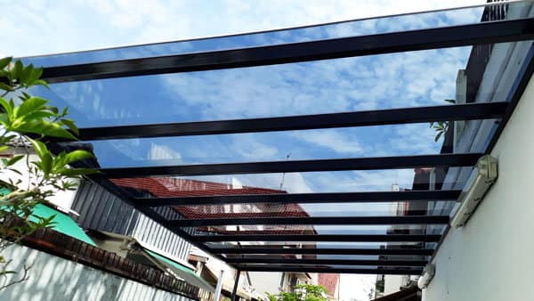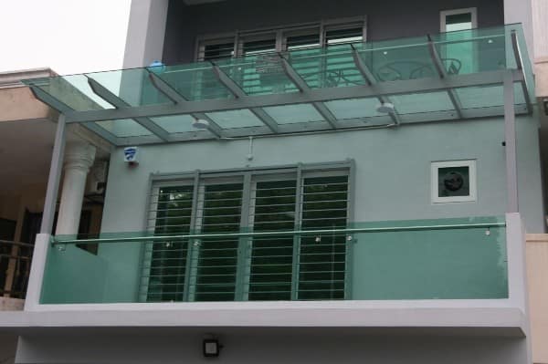Mewah dan classy antara ciri awning jenis kaca. Harganya agak mahal bermula dengan RM40 sekaki sesuai dengan kualitinya. Awning jenis tempered glass ini datang dalam dua bentuk iaitu rata dan melengkung. Ketahanannya juga sangat baik dan kaca tidak akan jatuh berderai sekiranya pecah kerana disokong dengan Polyvinyl Butyral (PVB).
