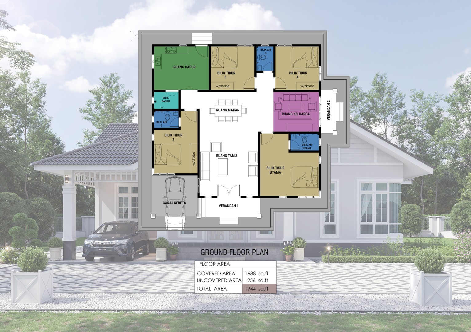 Saiz pelan ini berdasarkan pelan yang sedia ada. Pihak Mahligai Idaman tidak menetapkan sebarang jaminan bahawa pelan ini sesuai dengan bentuk atau keluasan tanah di tapak tanah lain. Kami juga tidak bertanggungjawab sekiranya pelan ini tidak mendapat kelulusan Pihak Berkuasa Tempatan (PBT) / Majlis Perbandaran di kawasan masing-masing.
