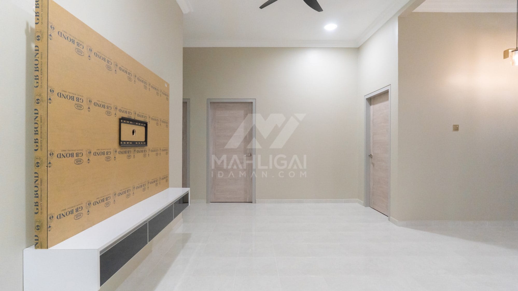 Banglo ini dibina dengan spesifikasi asas Pakej Silver dengan penambahan aksesori iaitu pemasangan cornice pada keseluruhan tingkap dan dinding luar rumah, groove line pada dinding di bahagian luar rumah