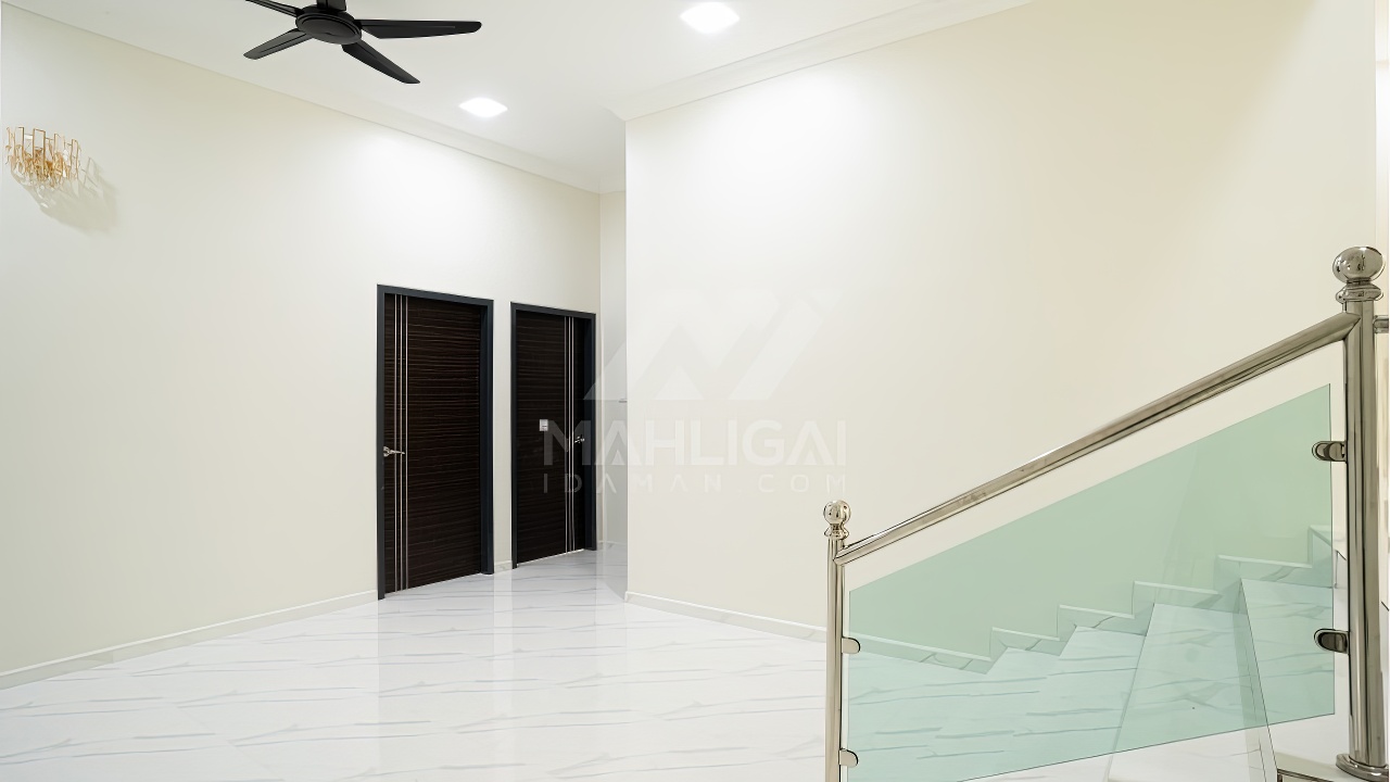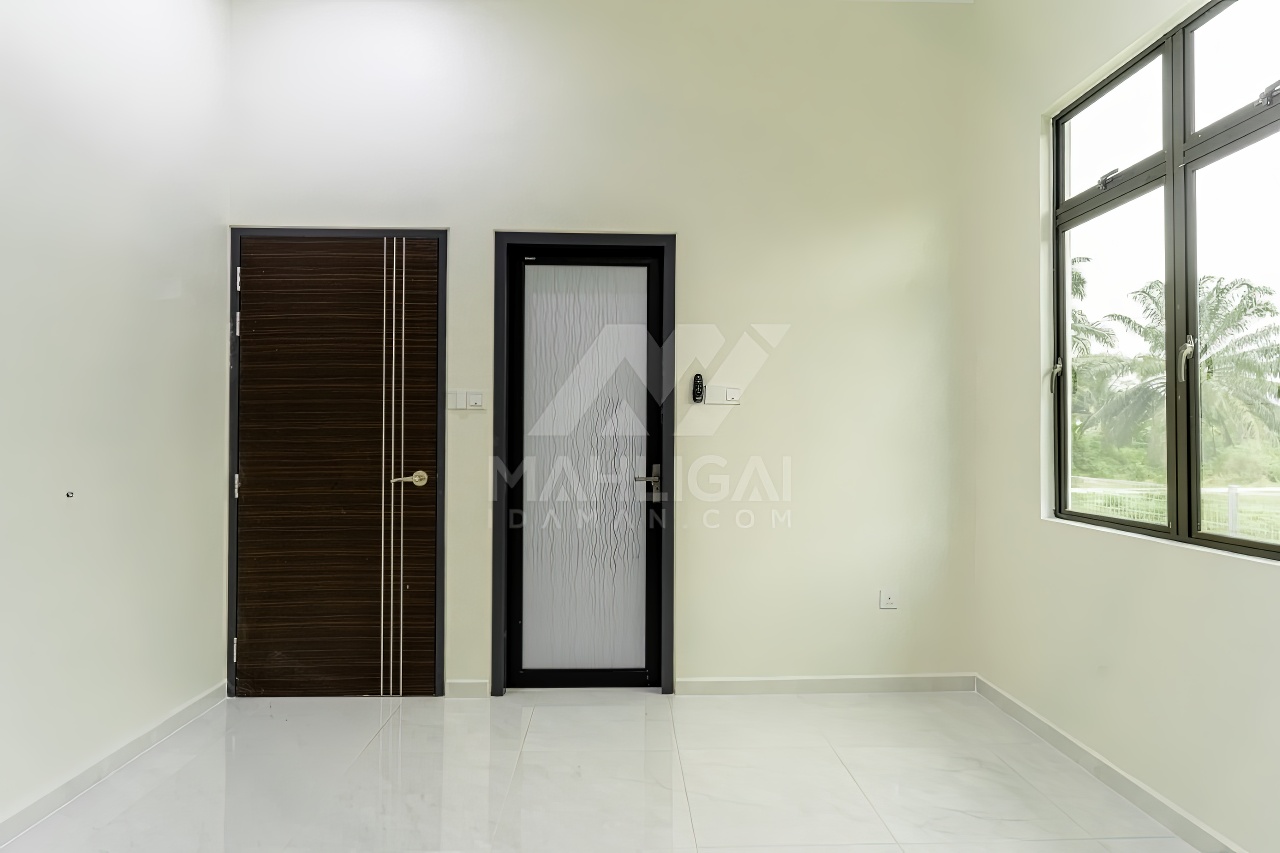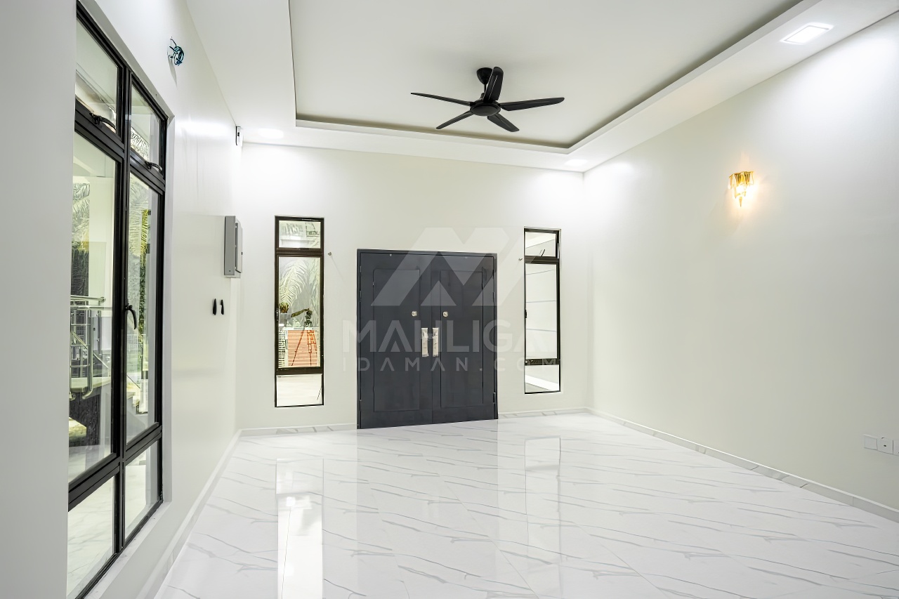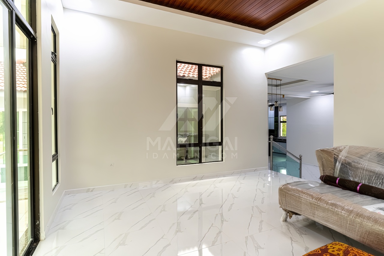 Banglo ini dibina dengan spesifikasi asas pakej gold dengan penambahan aksesori iaitu pemasangan cornice pada keseluruhan tingkap dan dinding luar rumah, groove line pada dinding di bahagian luar rumah