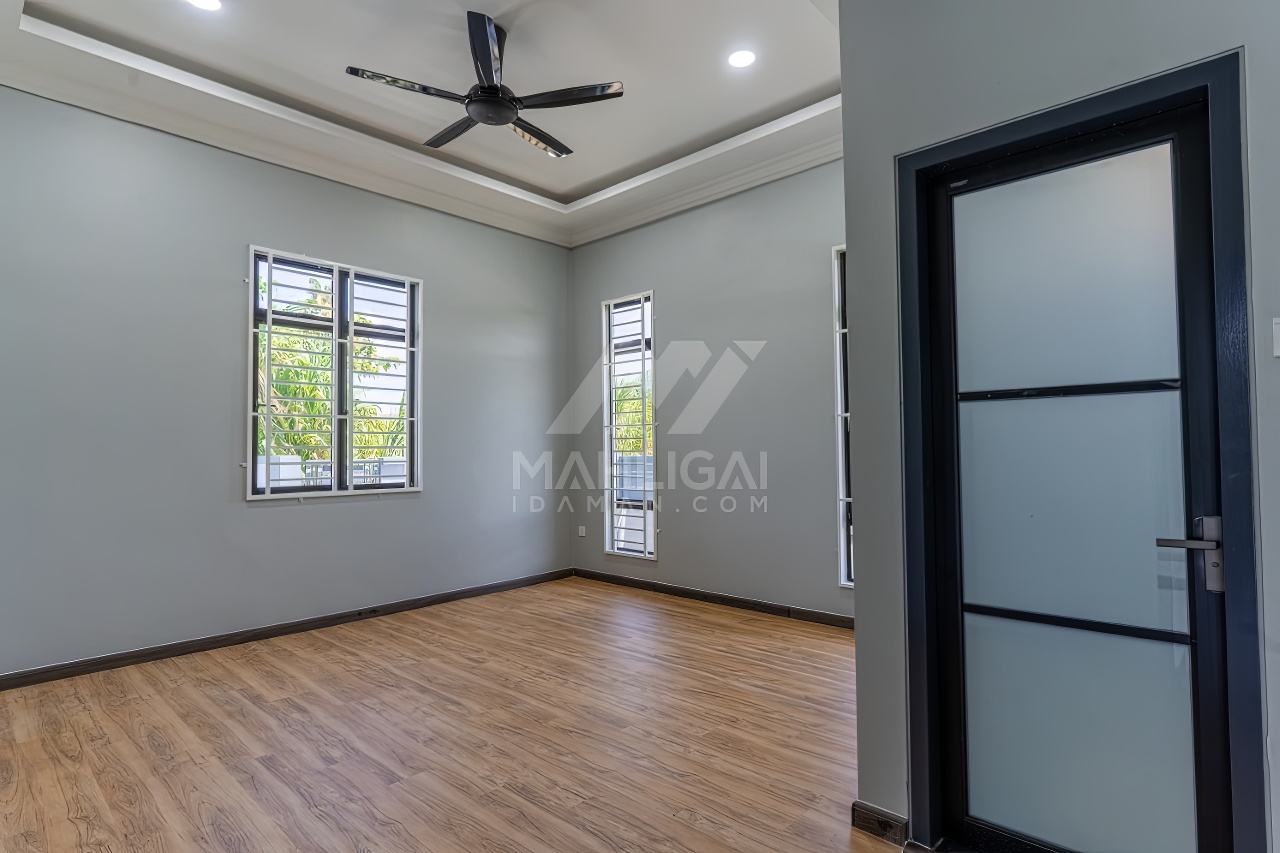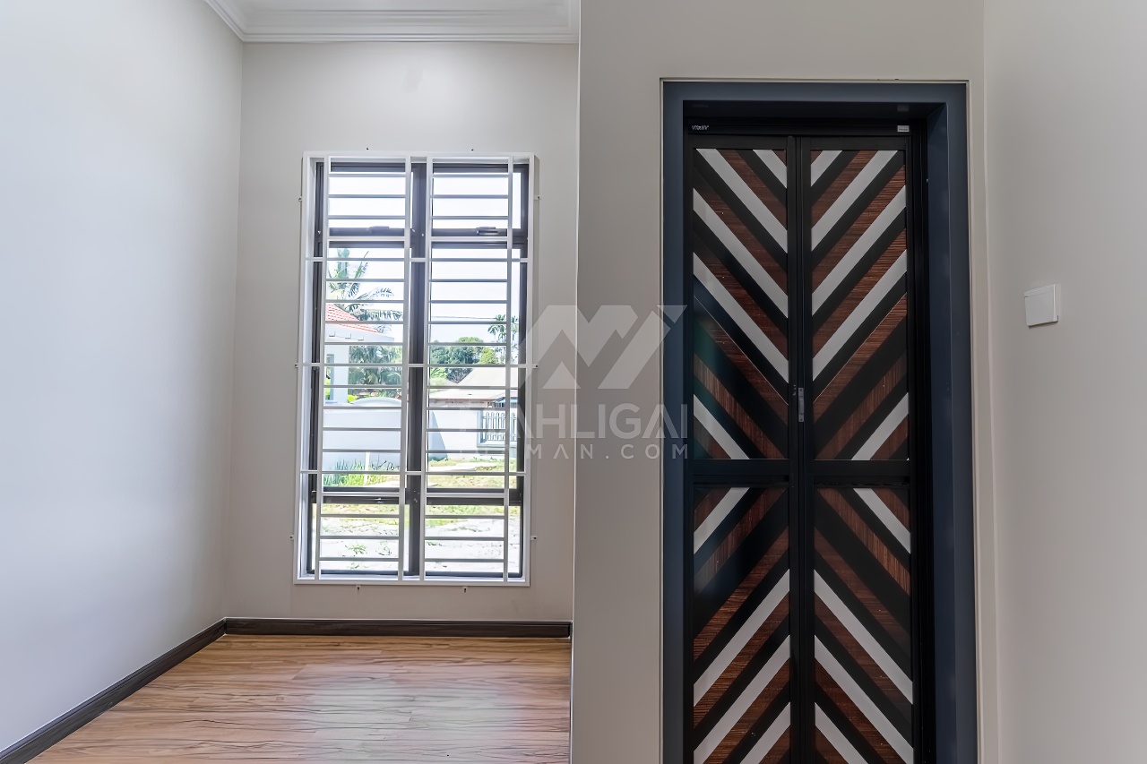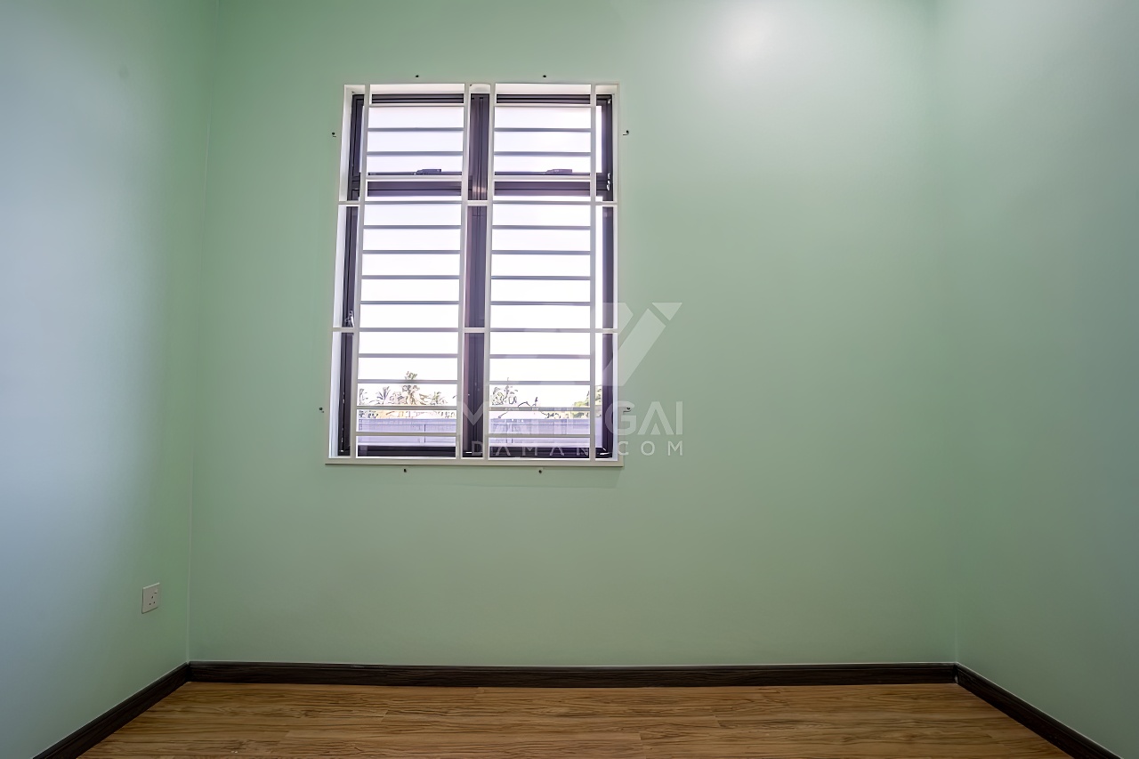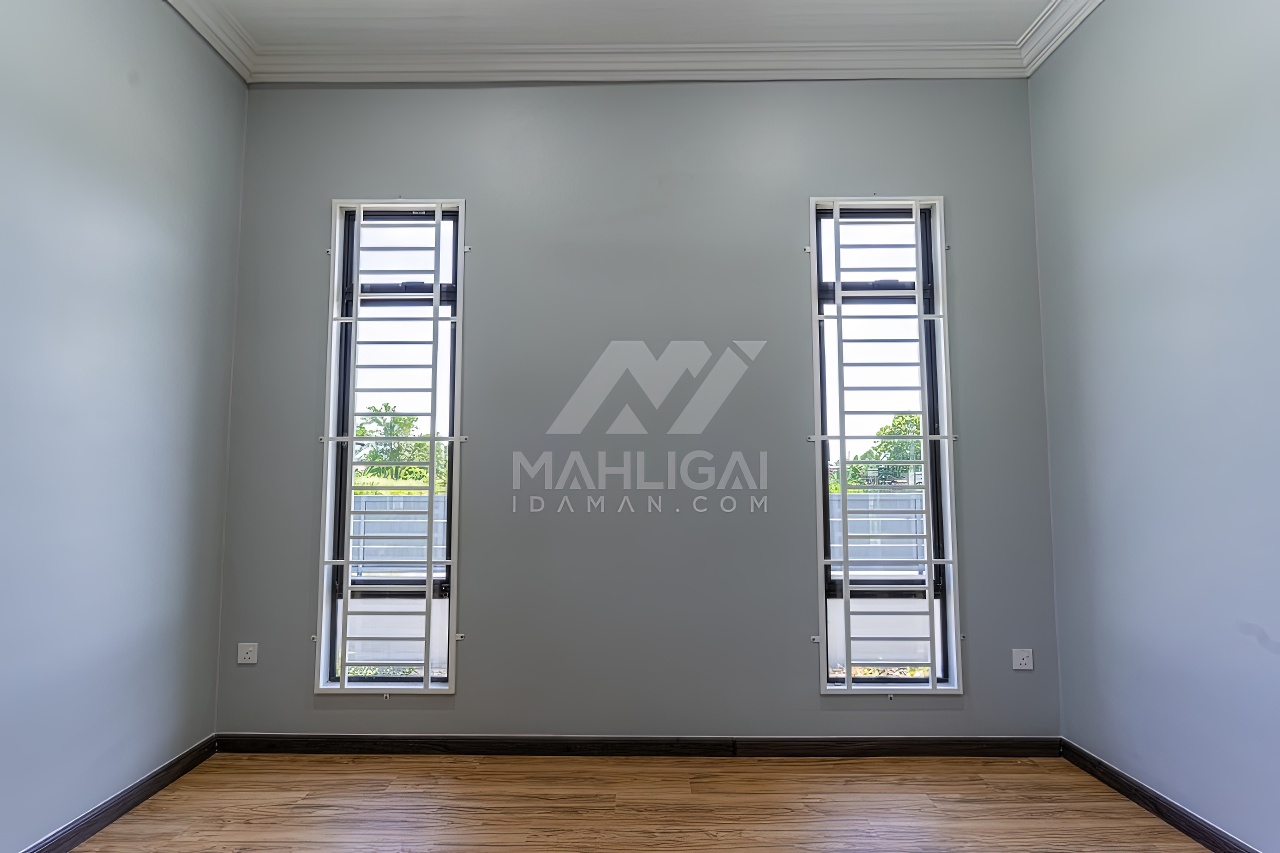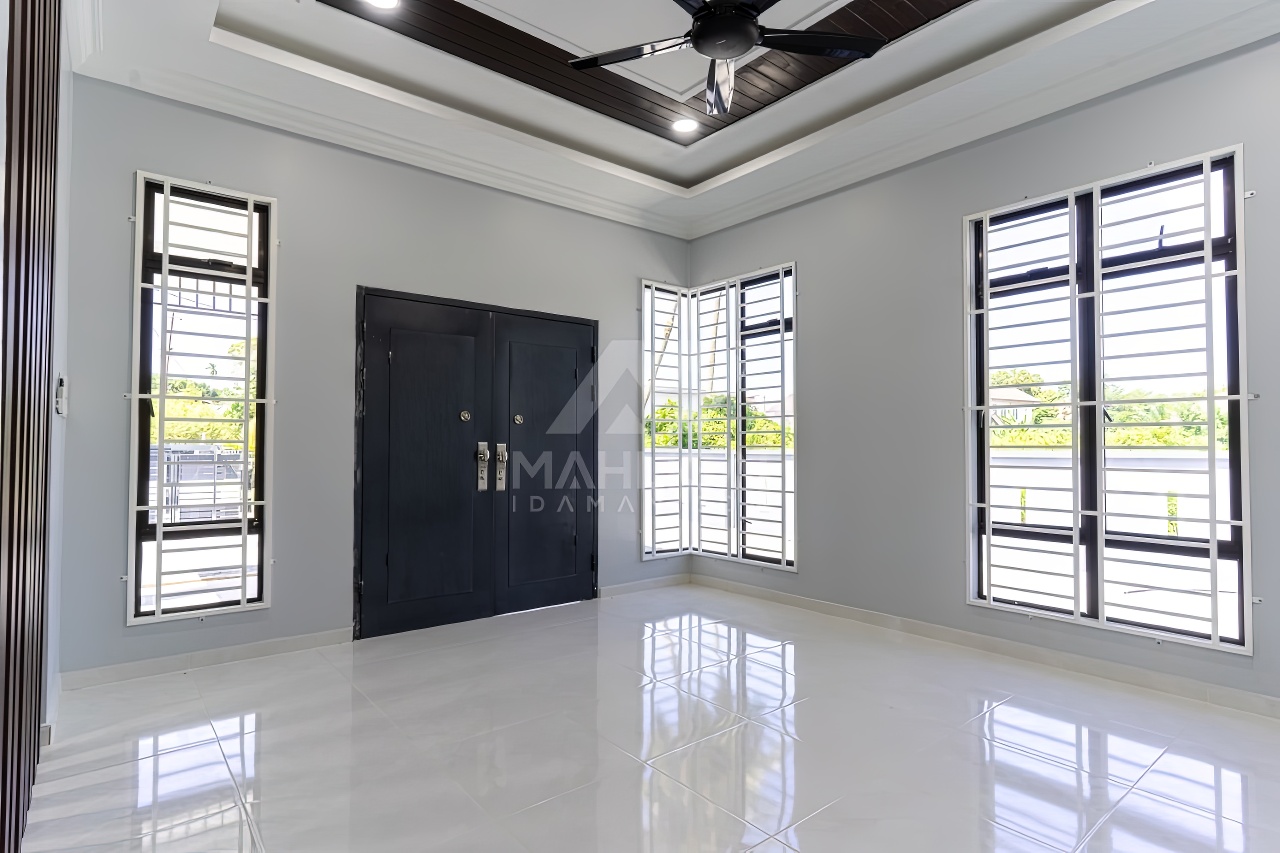 Banglo ini dibina dengan spesifikasi asas pakej gold dengan penambahan aksesori iaitu pemasangan cornice pada keseluruhan tingkap dan dinding luar rumah, groove line pada dinding di bahagian luar rumah