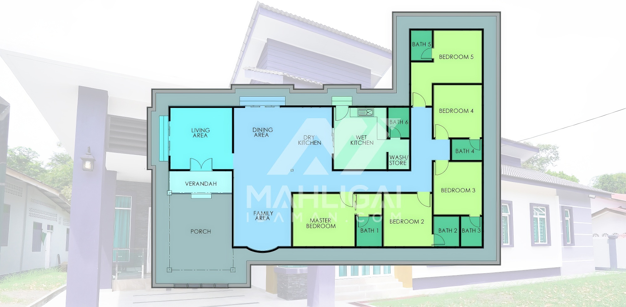 Banglo Idaman client kami lokasinya berdekatan UITM Machang, Kelantan. Banglo ini mempunyai lima bilik tidur dan enam bilik air. Banglo ini menggabungkan ciri-ciri berkonsepkan banglo moden seperti penggunaan tambahan ketinggian roof beam yang tinggi pada bahagian hadapan ruang tamu, hadapan ruang keluarga, ruang makan dan sebahagian ruang keluarga menampakan ruang yang lebih luas dan selesa bila berada di dalam rumah. Dari segi penggunaan gabungan tona warna unggu dan kuning ‘King Ransom’ nenambahkan lagi keunikan banglo moden ini.