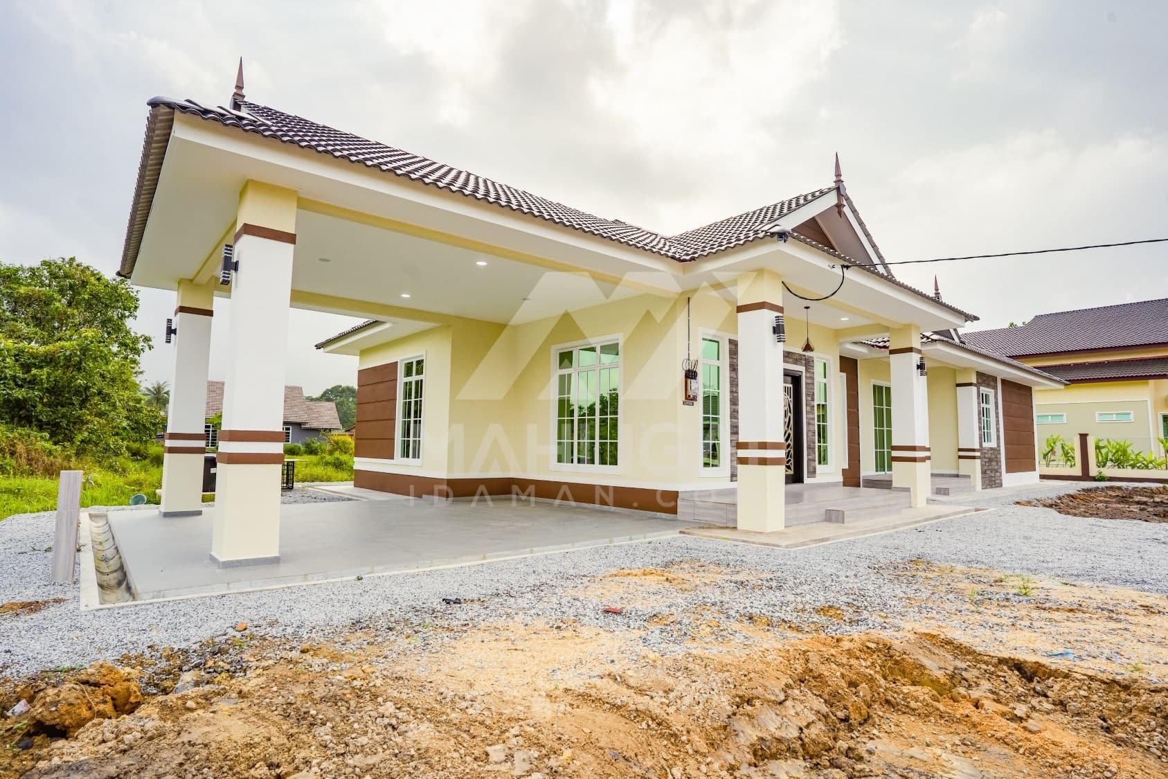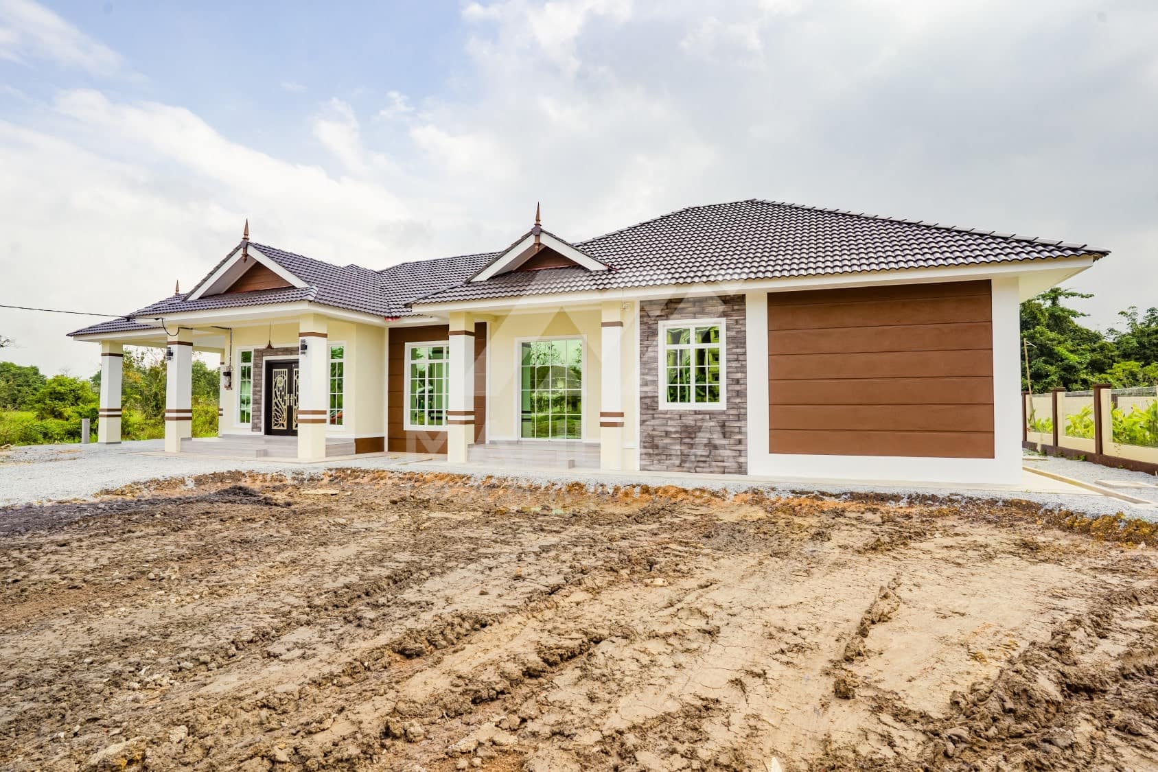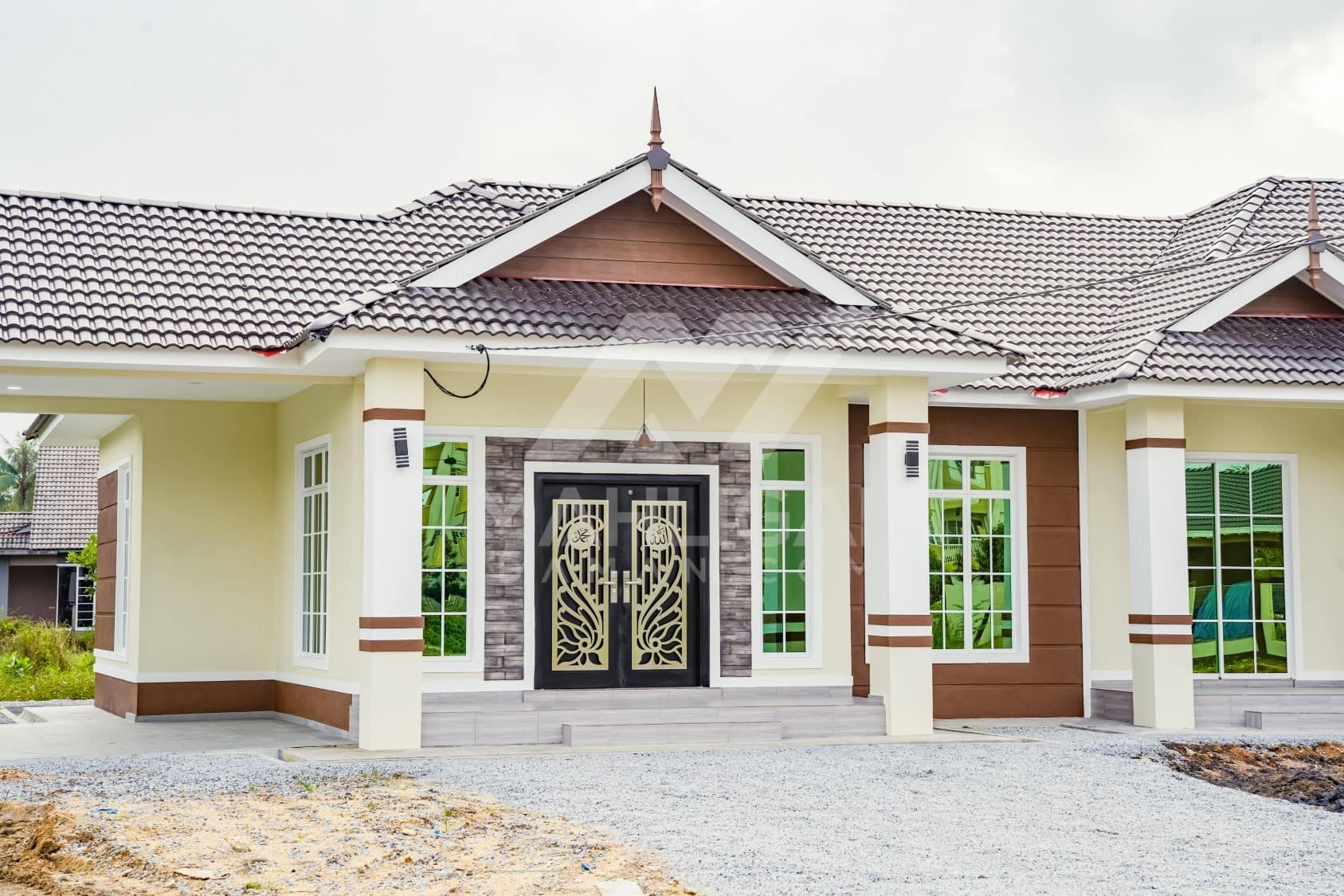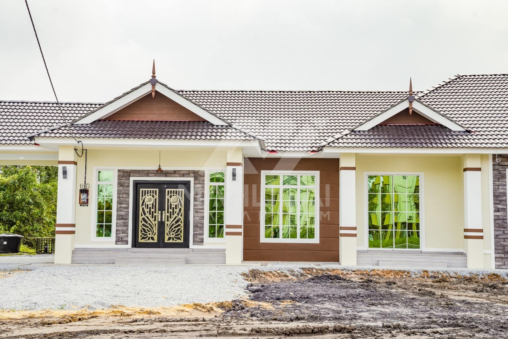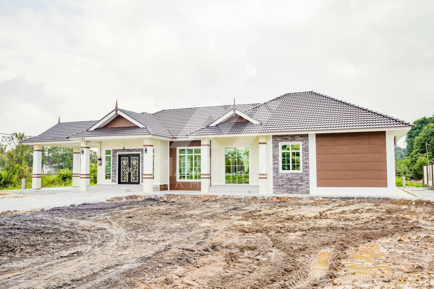 Kini banglo 1 tingkat milik klien kami Pn Hasnah Ali telah siap dibina sepenuhnya di Marang, Terengganu. Banglo ini dilengkapi dengan lima bilik tidur dan empat bilik air. Banglo yang berkeluasan 2,500 kaki persegi ini menggabungkan ciri-ciri banglo moden iaitu dari segi rekabentuk dalaman dan luaran yang sangat menarik. Dari segi penggunaan warna coklat dan kuning. Bahagian dalam rumah pula mereka memilih warna putih, menaikan lagi seri dan kemewahan dalam rumah.