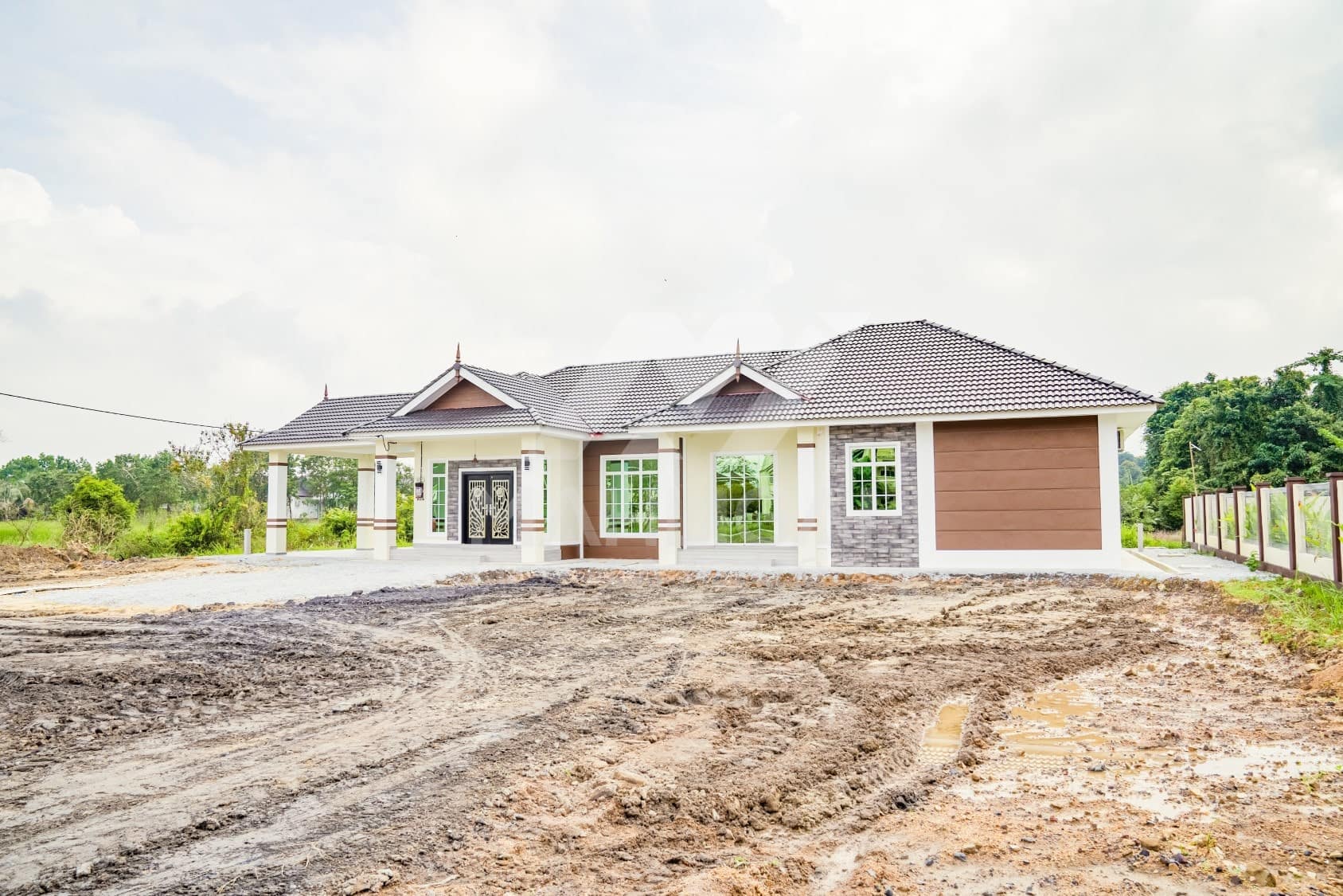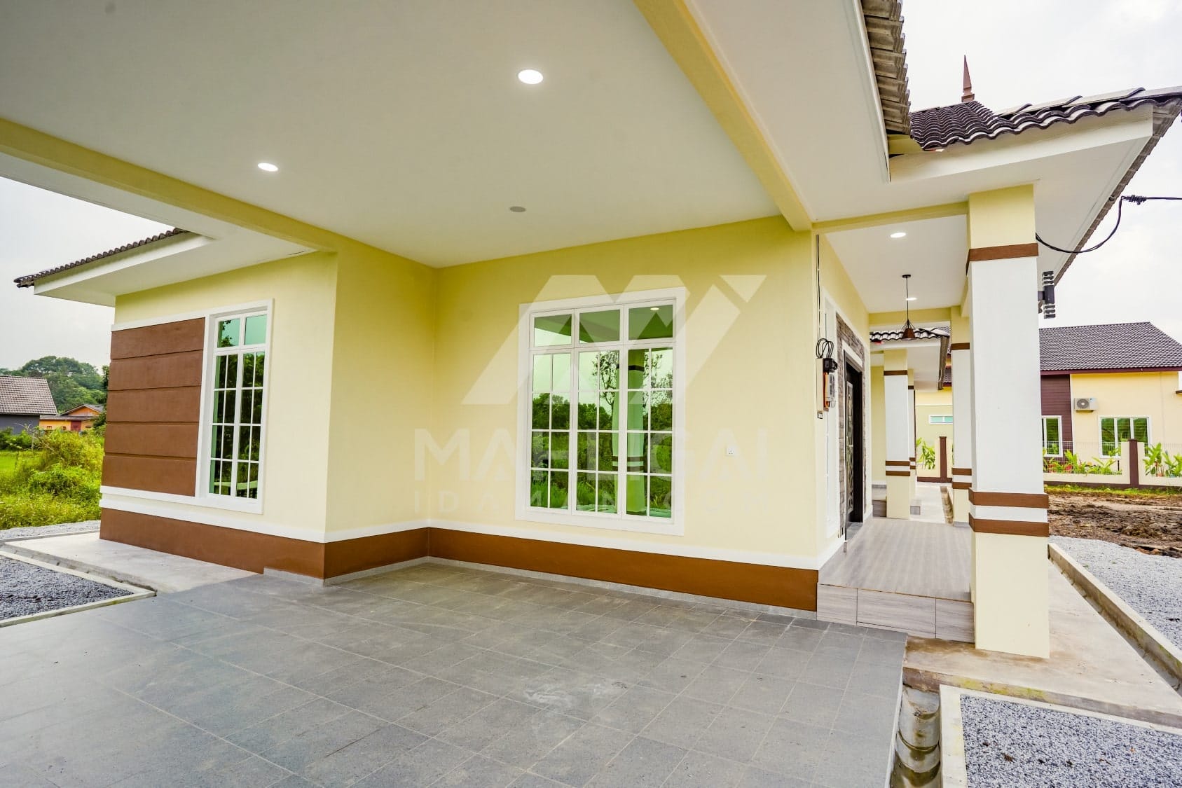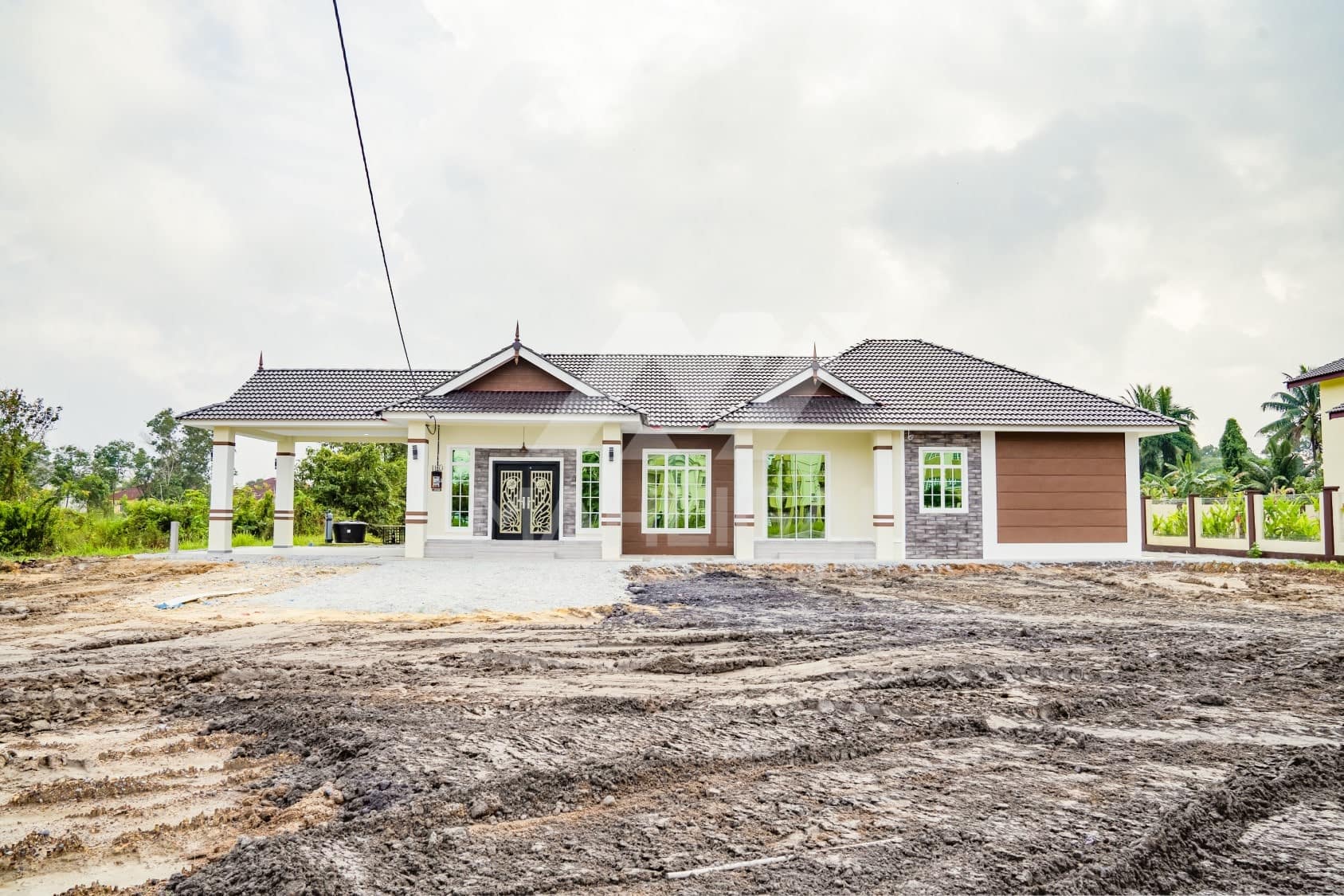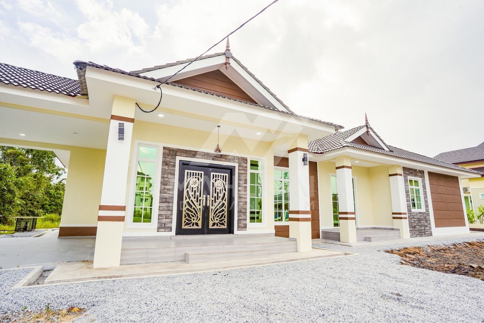 Kini banglo 1 tingkat milik klien kami Pn Hasnah Ali telah siap dibina sepenuhnya di Marang, Terengganu. Banglo ini dilengkapi dengan lima bilik tidur dan empat bilik air. Banglo yang berkeluasan 2,500 kaki persegi ini menggabungkan ciri-ciri banglo moden iaitu dari segi rekabentuk dalaman dan luaran yang sangat menarik. Dari segi penggunaan warna coklat dan kuning. Bahagian dalam rumah pula mereka memilih warna putih, menaikan lagi seri dan kemewahan dalam rumah.