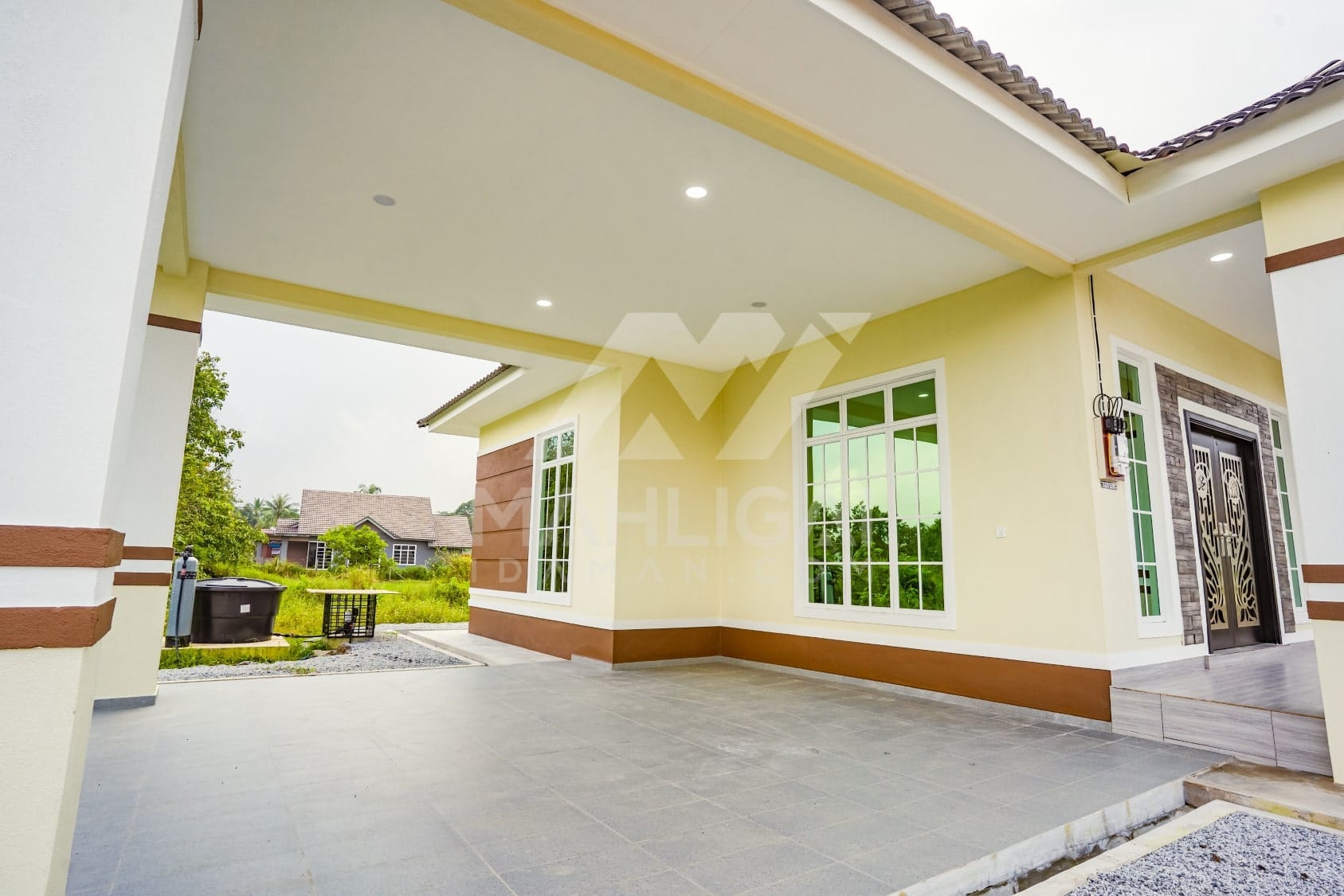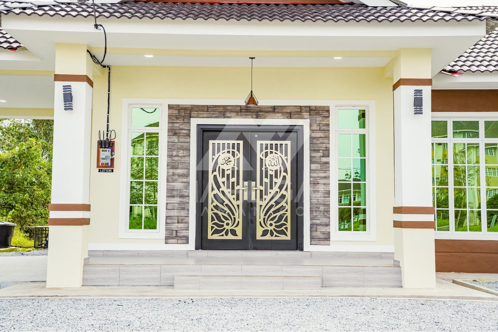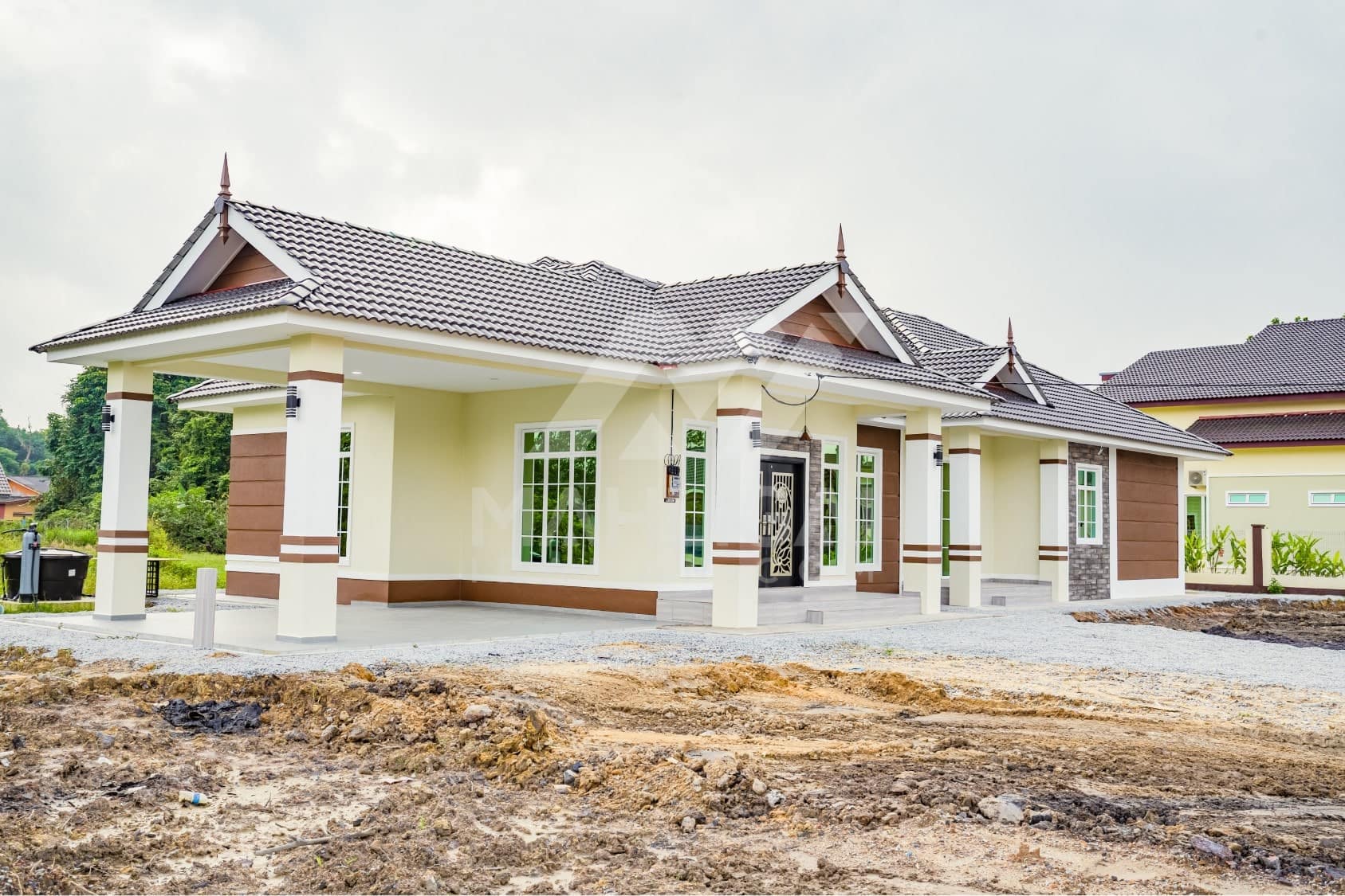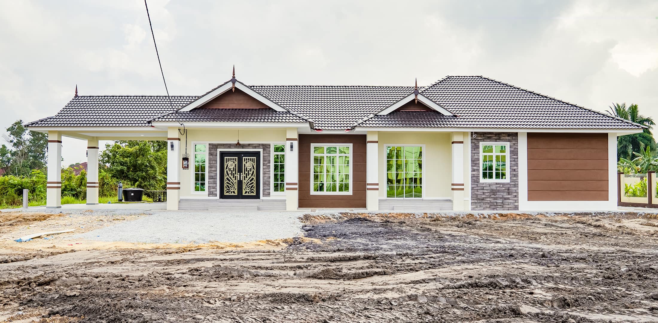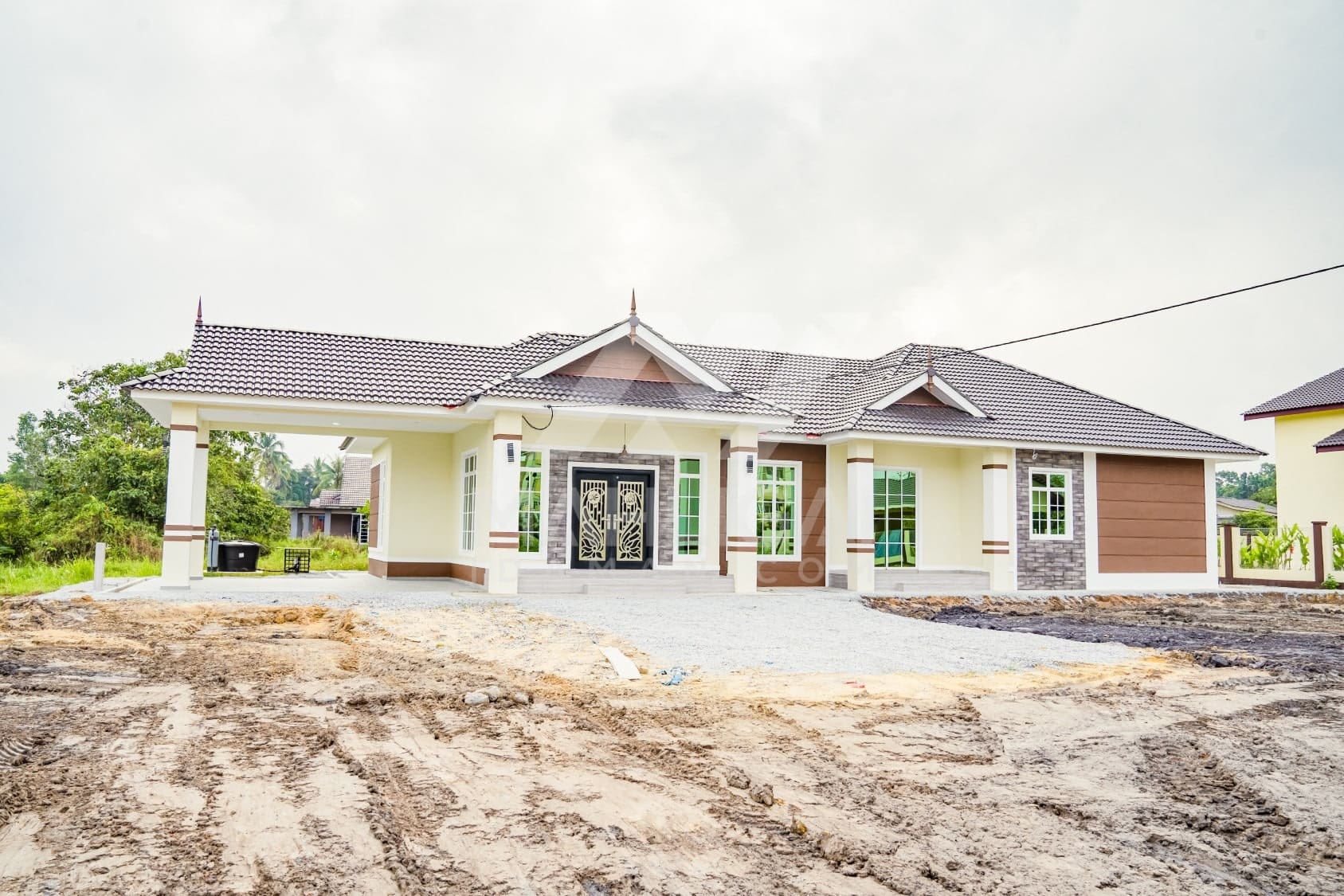 Kini banglo 1 tingkat milik klien kami Pn Hasnah Ali telah siap dibina sepenuhnya di Marang, Terengganu. Banglo ini dilengkapi dengan lima bilik tidur dan empat bilik air. Banglo yang berkeluasan 2,500 kaki persegi ini menggabungkan ciri-ciri banglo moden iaitu dari segi rekabentuk dalaman dan luaran yang sangat menarik. Dari segi penggunaan warna coklat dan kuning. Bahagian dalam rumah pula mereka memilih warna putih, menaikan lagi seri dan kemewahan dalam rumah.