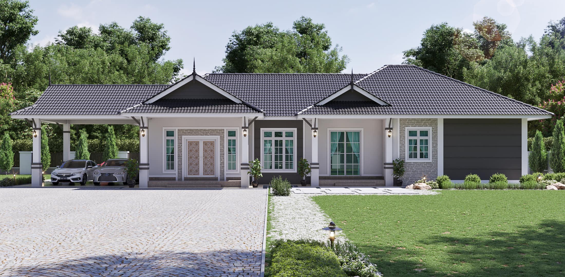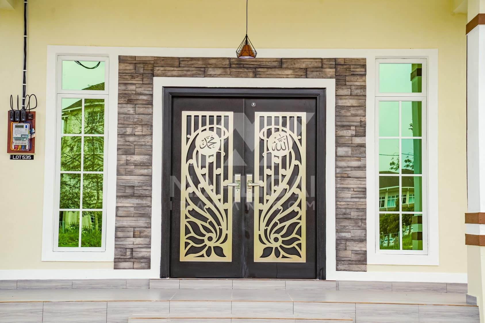 Banglo ini dibina dengan spesifikasi asas Pakej Silver dengan penambahan aksesori iaitu pemasangan cornice pada keseluruhan tingkap dan dinding luar rumah, groove line pada dinding di bahagian luar rumah.