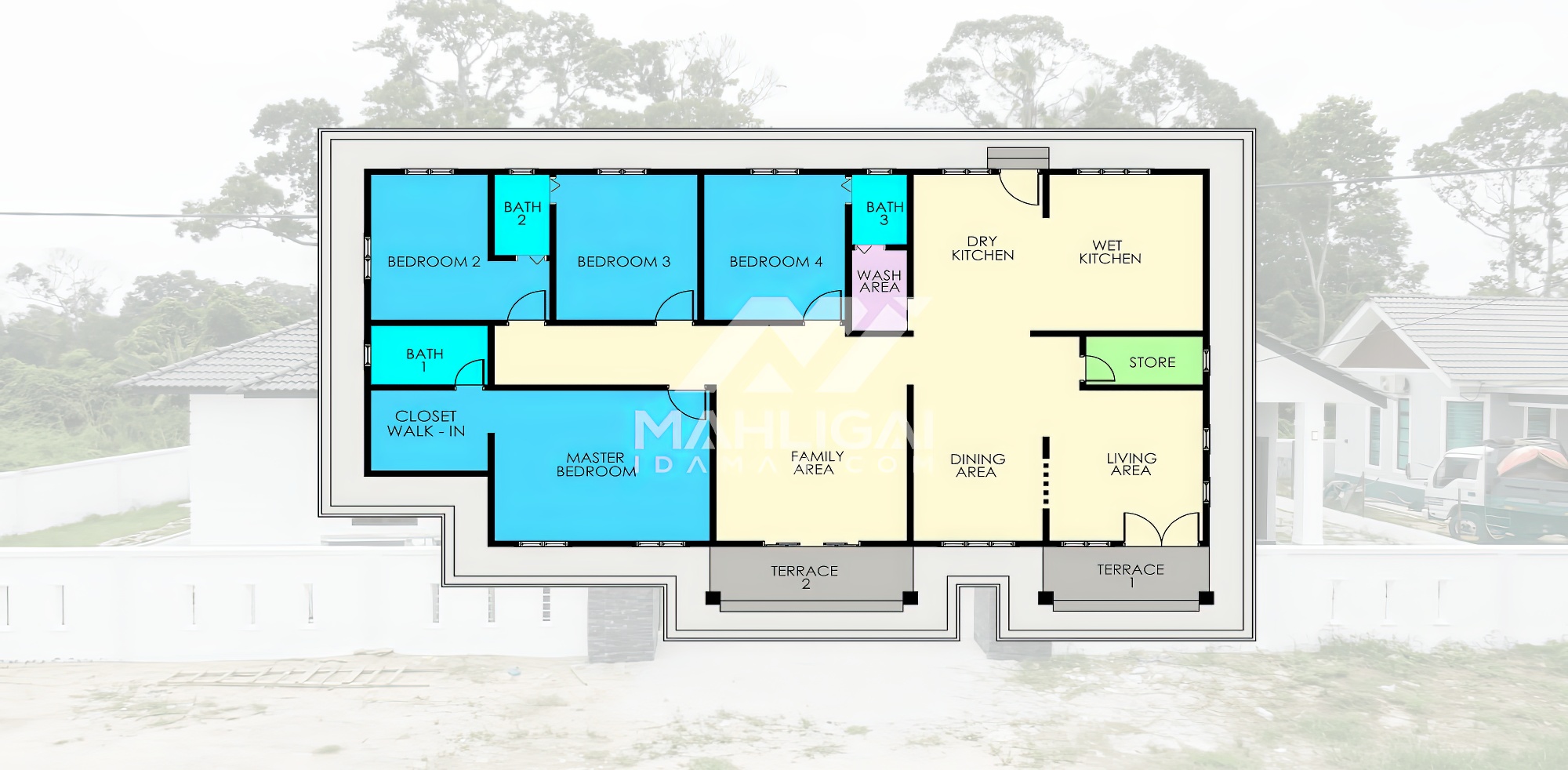 Banglo satu tingkat milik klien kami Tuan Suhaimi Fajri telah siap dibina sepenuhnya di Melor, Kelantan. Banglo ini dilengkapi dengan empat (4) bilik tidur dan tiga (3) bilik air. Banglo yang berkeluasan 2,426 kaki persegi ini menggabungkan ciri-ciri banglo moden iaitu dari segi rekabentuk dalaman dan luaran yang sangat menarik dari segi penggunaan warna putih dan Kelabu. Bahagian dalam rumah pula mereka memilih warna biru dan hijau menaikan lagi seri dan kemewahan dalam rumah.