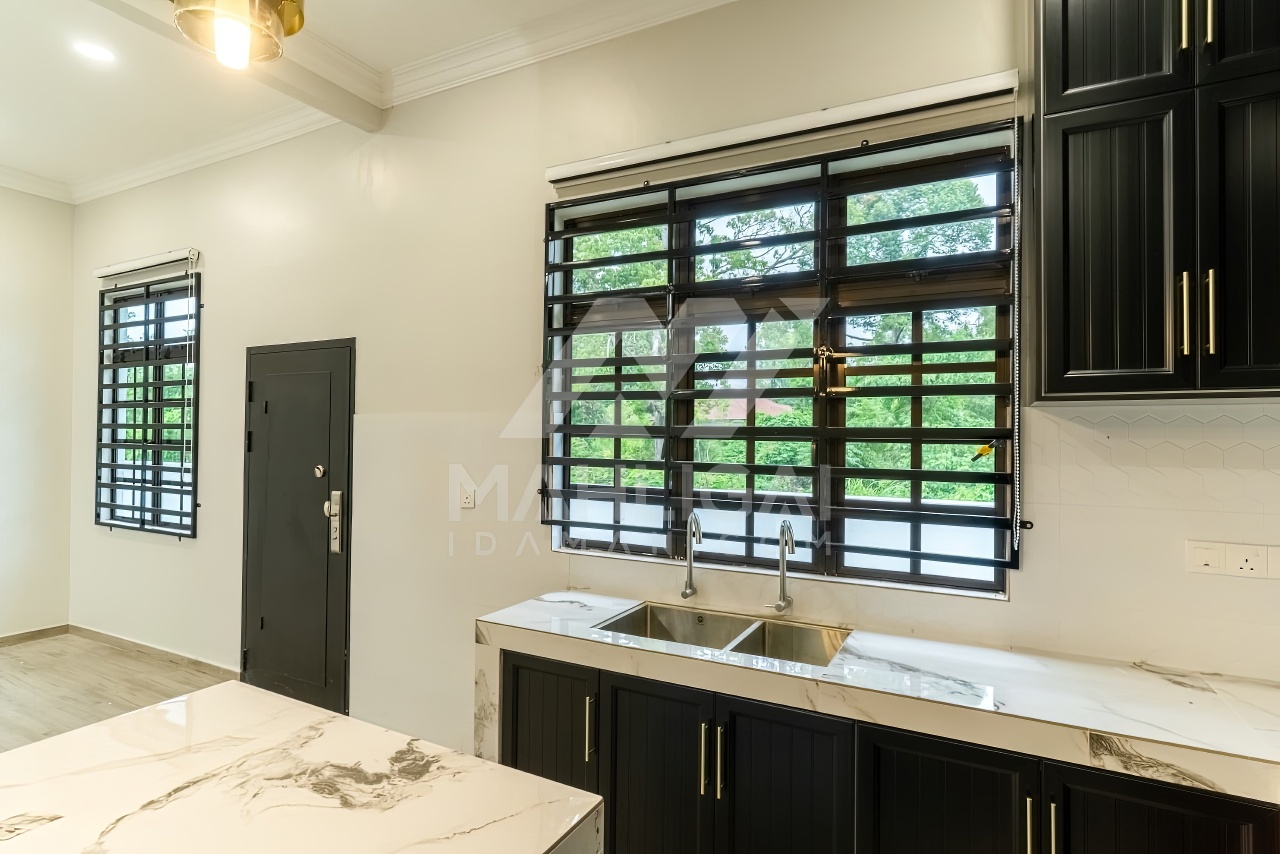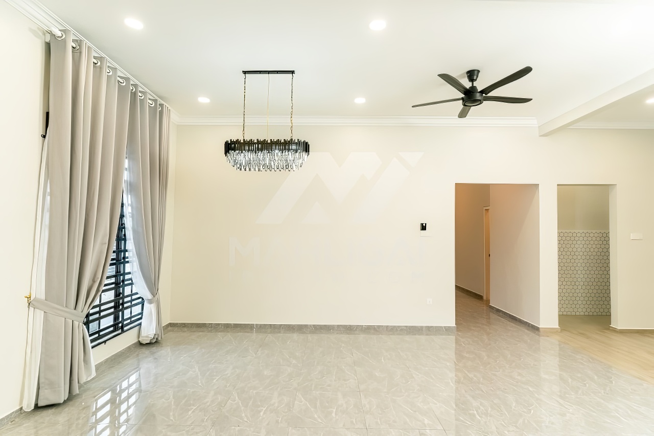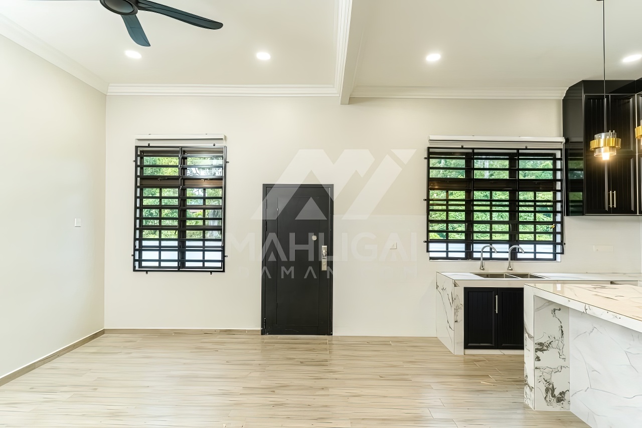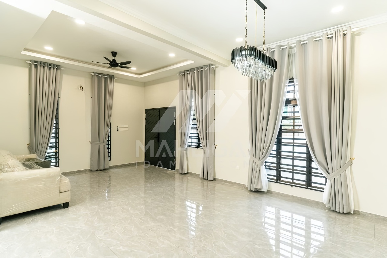 Banglo ini dibina dengan spesifikasi asas pakej gold dengan penambahan aksesori iaitu pemasangan cornice pada keseluruhan tingkap dan dinding luar rumah, groove line pada dinding di bahagian luar rumah