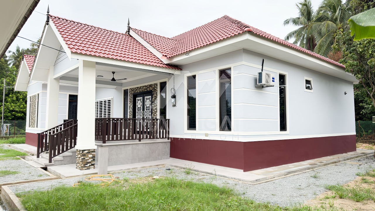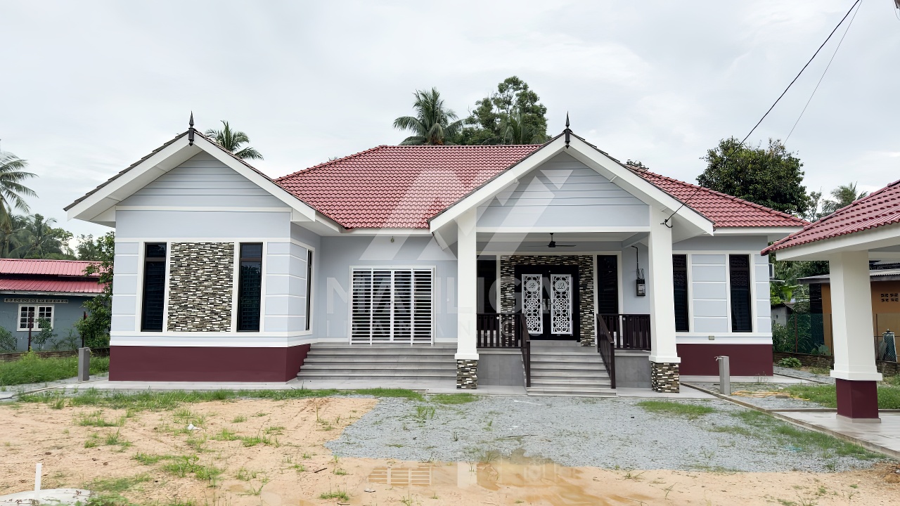 Banglo satu tingkat milik klien kami Encik Faiez telah siap dibina sepenuhnya di Kemumin, Kota Bharu, Kelantan. Banglo ini dilengkapi dengan lima (5) bilik tidur dan empat (4) bilik air. Banglo yang berkeluasan 2,555 kaki persegi ini menggabungkan ciri-ciri banglo moden iaitu dari segi rekabentuk dalaman dan luaran yang sangat menarik dari segi penggunaan warna biru pastel dan maroon. Bahagian dalam rumah pula mereka memilih warna putih menaikkan lagi seri dan kemewahan dalam rumah.