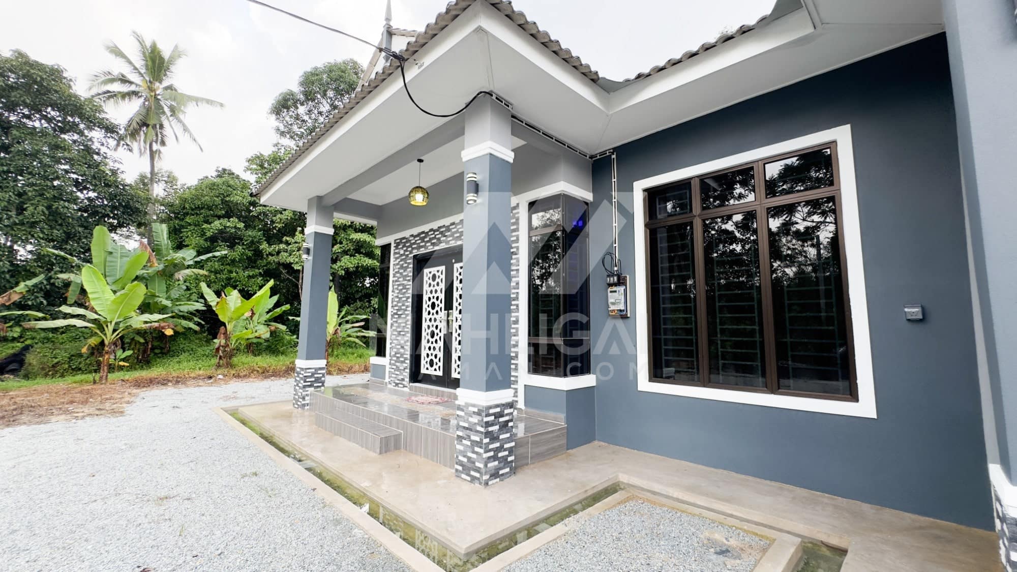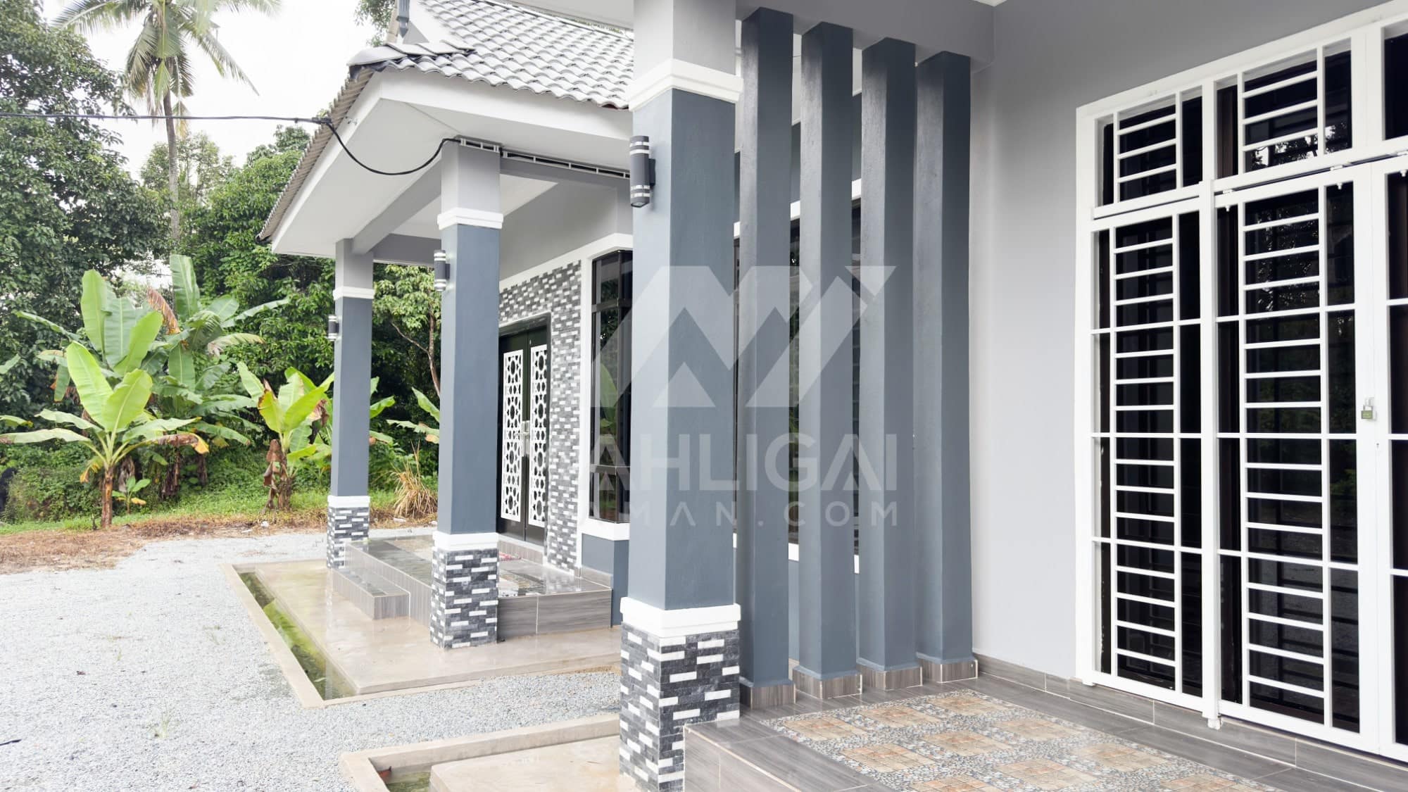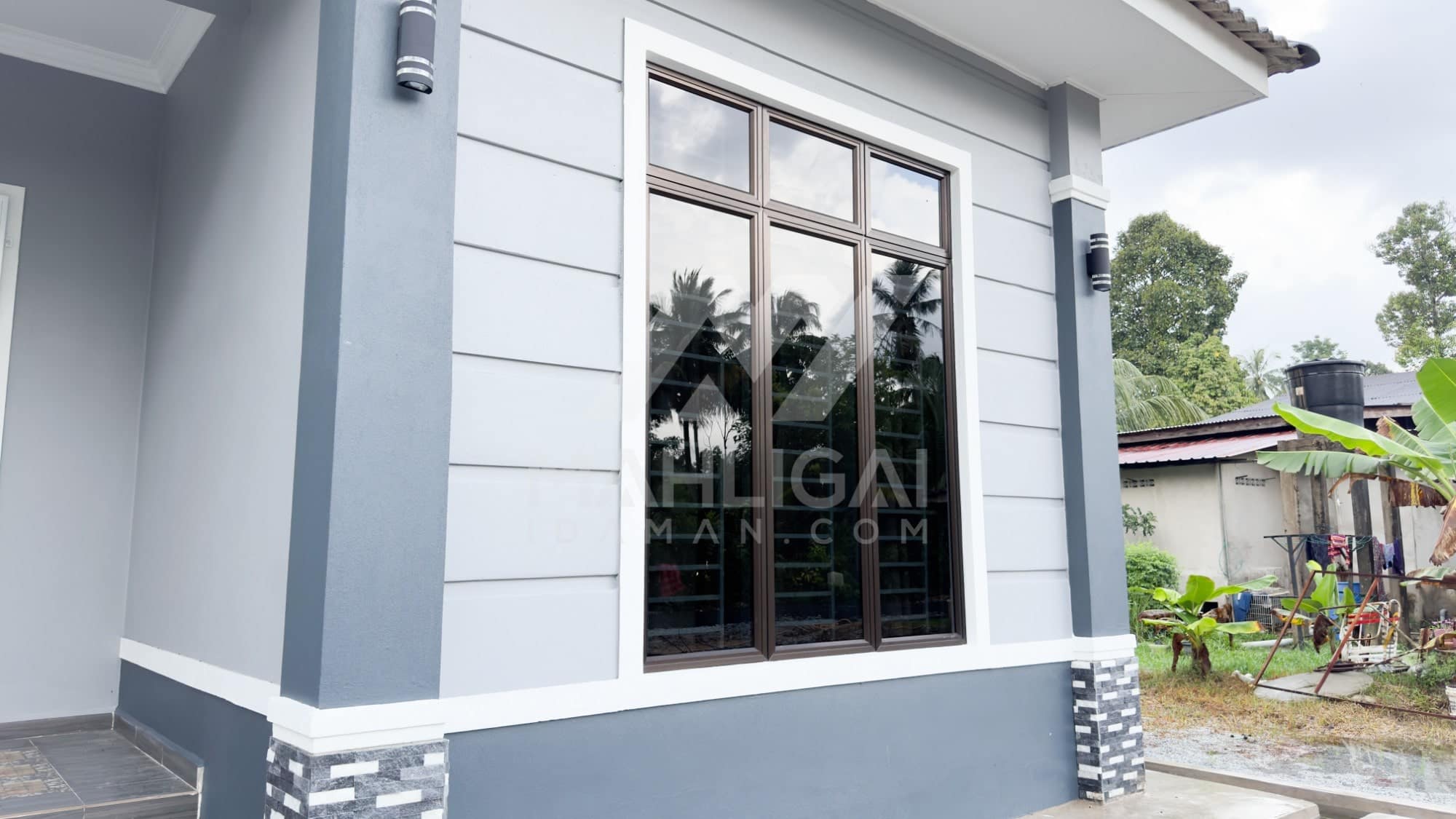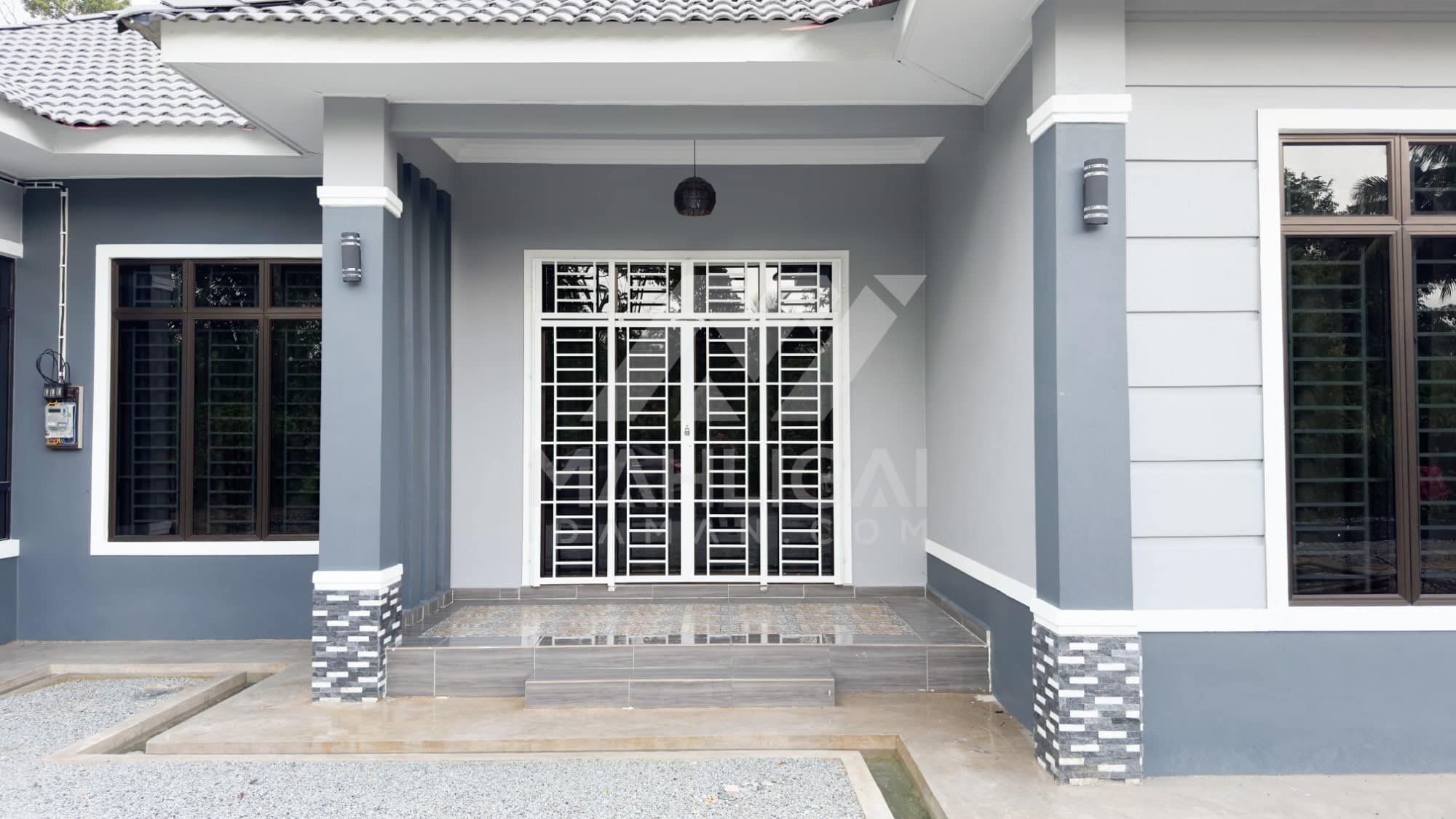 Banglo ini dibina dengan spesifikasi asas Pakej Silver dengan penambahan aksesori iaitu pemasangan cornice pada keseluruhan tingkap dan dinding luar rumah, groove line pada dinding di bahagian luar rumah.