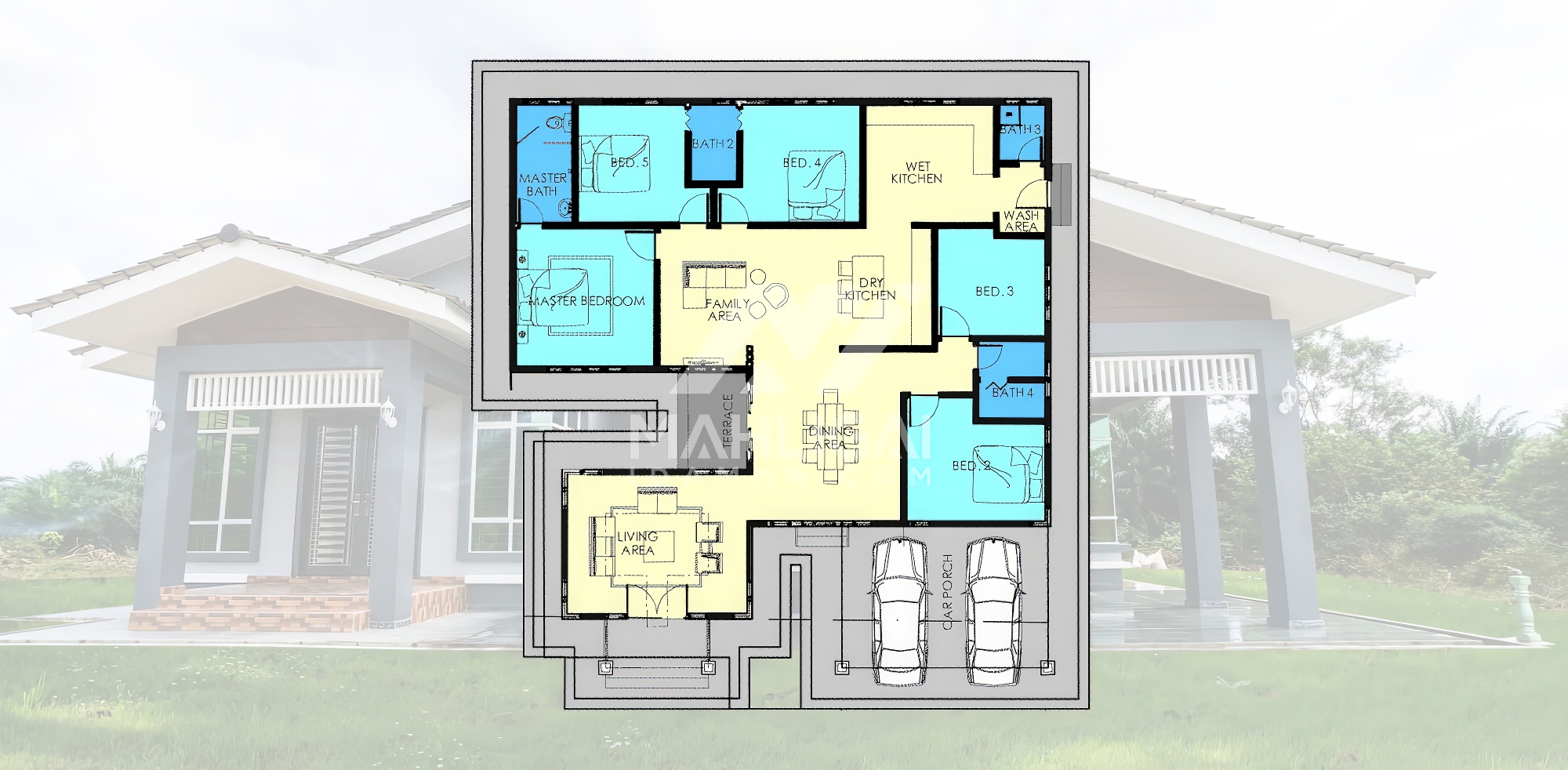 Banglo ini dibina dengan spesifikasi asas Pakej Gold dan beberapa penambahan dari sudut design seperti pemasangan shera board pada bahagian dinding dan bumbung rumah, torehan groove line pada bahagian bumbung tepi, pemasangan kayu hiasan aluminium (louvres) pada bahagian porch dan pintu masuk.