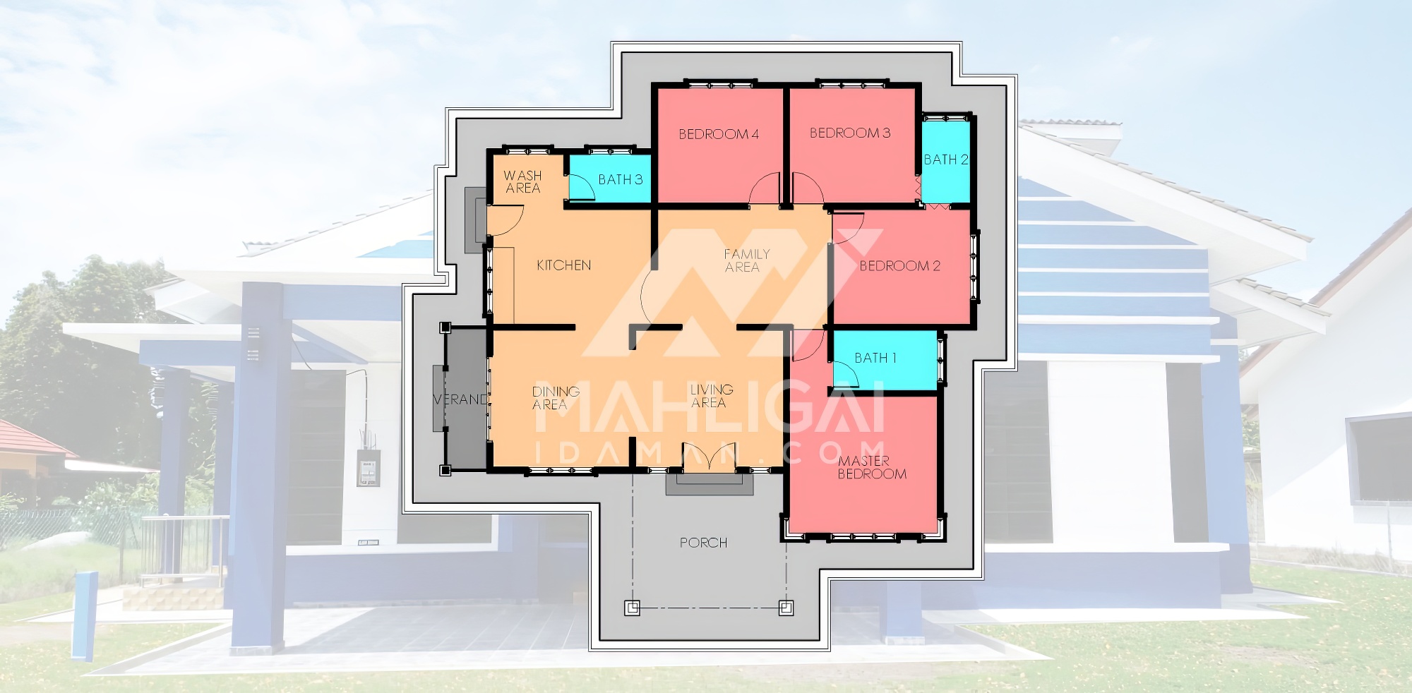 Banglo satu tingkat berwarna biru yang telah siap dibina di Besut, Terengganu ini mempunyai empat (4) bilik tidur dan tiga (3) bilik air. Banglo ini berkonsepkan banglo moden seperti penggunaan tingkap labuh dilengkapi dengan pemasangan shera board di bahagian tengah tingkap menampakkan lagi keunikan banglo ini.