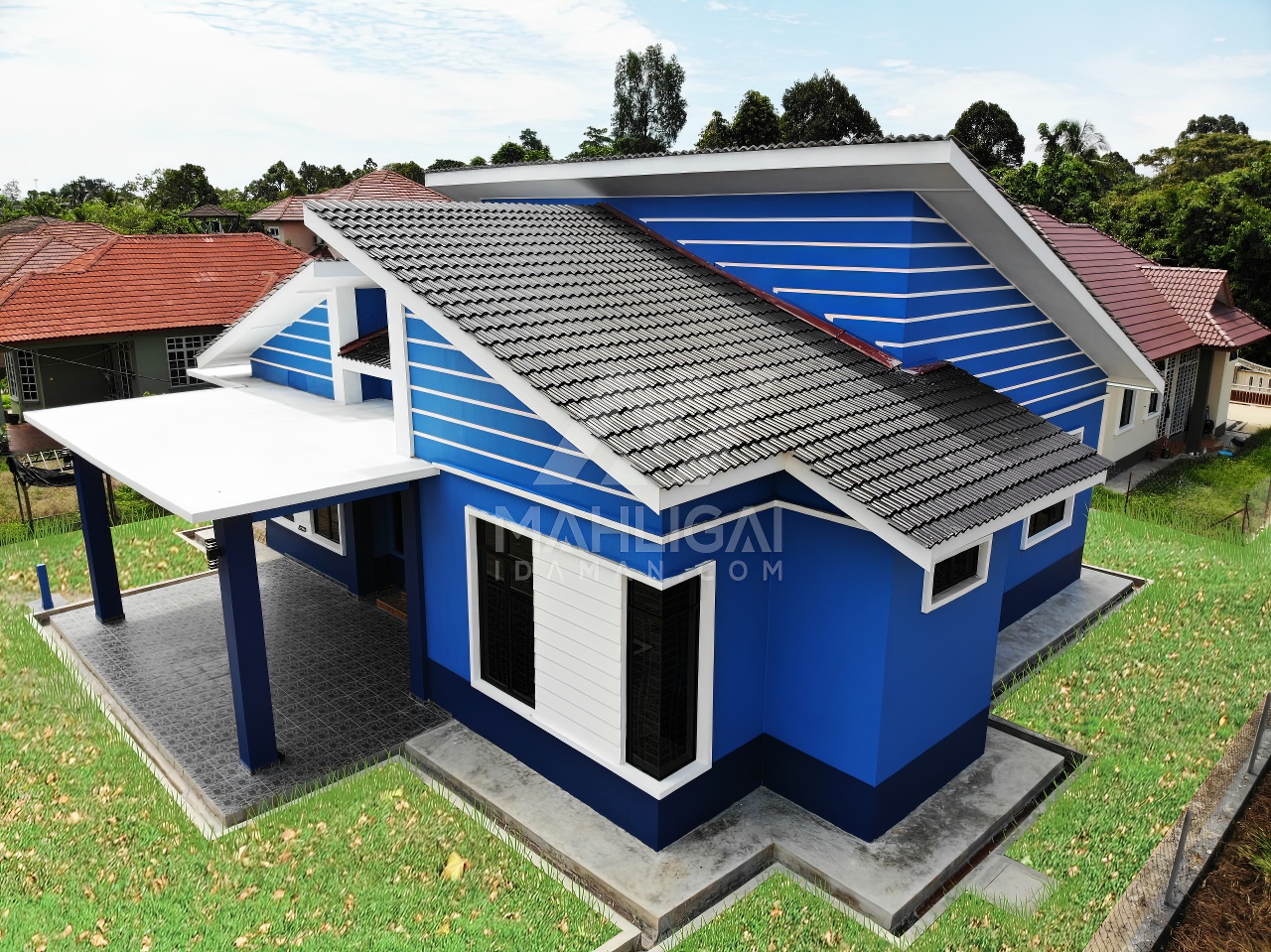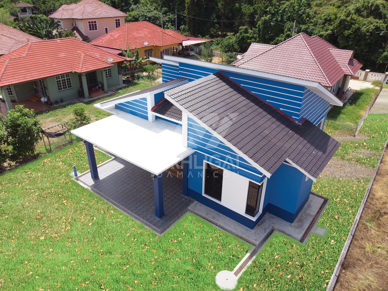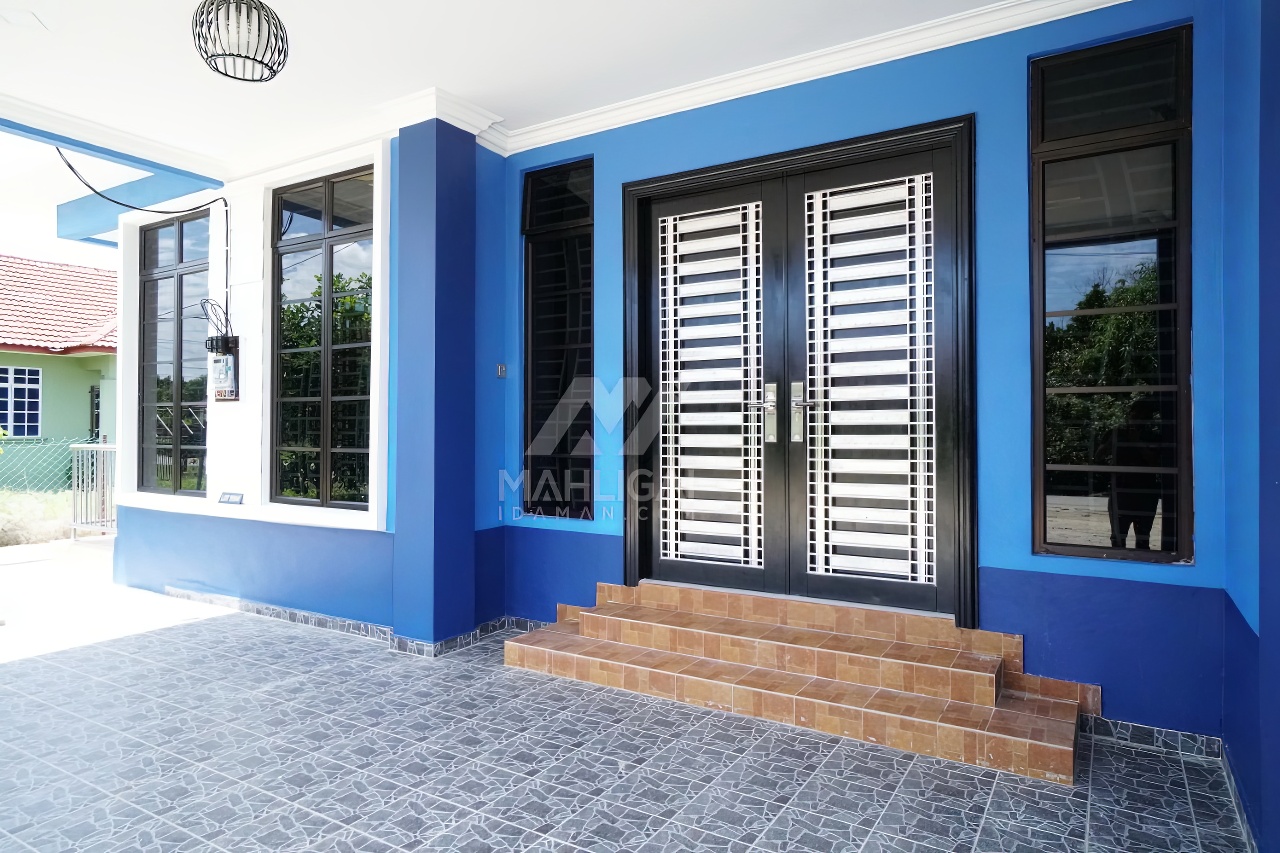 Banglo satu tingkat berwarna biru yang telah siap dibina di Besut, Terengganu ini mempunyai empat (4) bilik tidur dan tiga (3) bilik air. Banglo ini berkonsepkan banglo moden seperti penggunaan tingkap labuh dilengkapi dengan pemasangan shera board di bahagian tengah tingkap menampakkan lagi keunikan banglo ini.