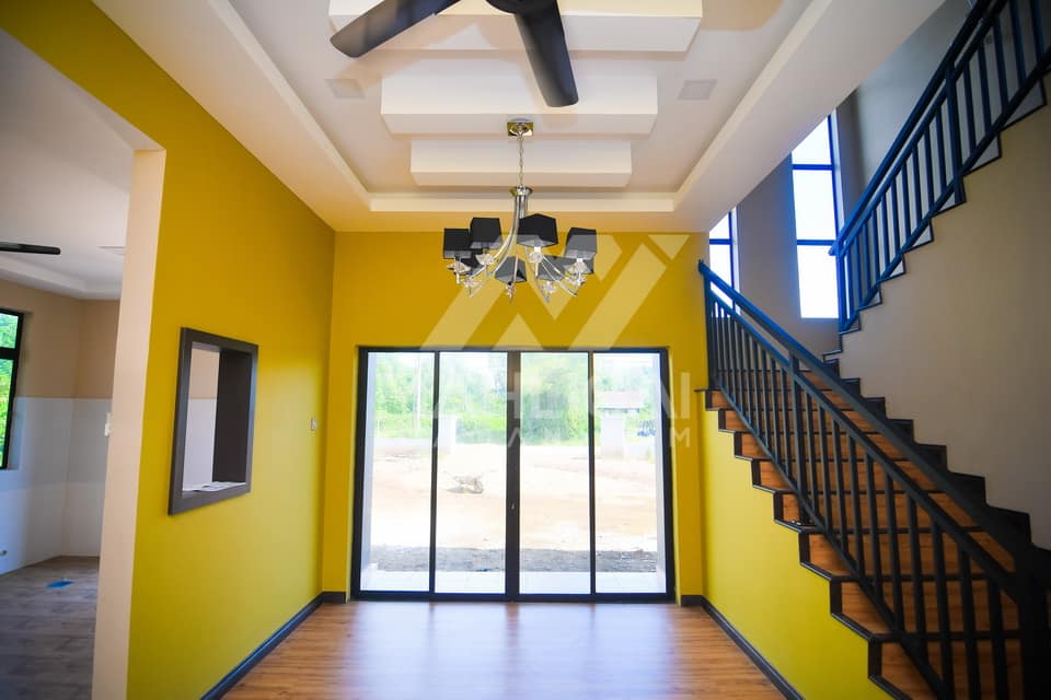 Banglo ini dibina dengan spesifikasi asas Pakej Gold dan beberapa penambahan dari sudut design seperti torehan groove line pada bahgian dinding luar rumah, pemasangan cornice pada bahagian tingkap serta pemasangan batu hiasan pada pintu masuk utama.