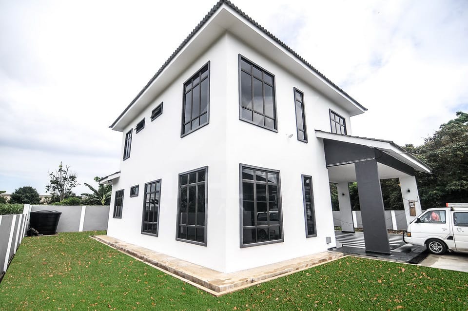 Banglo Idaman klien kami lokasinya di Pahang. Banglo ini mempunyai enam bilik tidur dan empat bilik air yang berkeluasan 2,878 kaki persegi. Klien memilih untuk menggunakan tingkap cermin gelap berserta frame dark brown menampakkan lebih premium serta penggunaan warna putih pada keseluruhan luar rumah menjadikan kawasan rumah kelihatan lebih luas.
