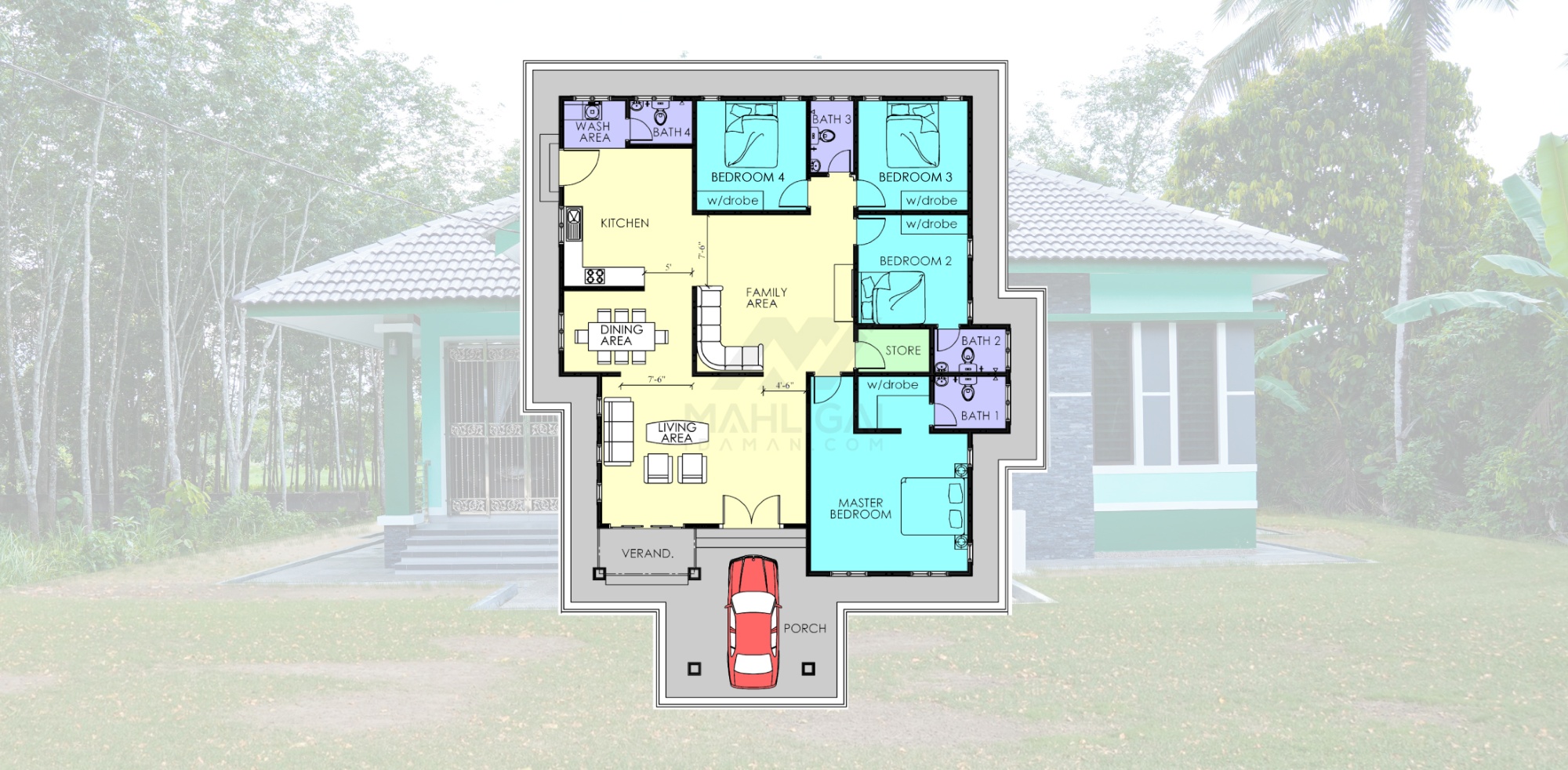 Banglo satu tingkat yang dibina di daerah Pasir Mas, Kelantan ini mempunyai empat (4) bilik tidur dan empat (4) bilik air. Banglo ini menggabungkan ciri-ciri banglo konvensional seperti bentuk atap disamping menerapkan beberapa ciri moden seperti penggunaan tingkap labuh dan tona warna green mint yang digabungkan dengan warna hijau terang untuk menaikkan kontra warna tersebut.