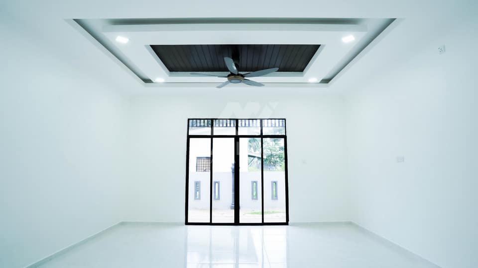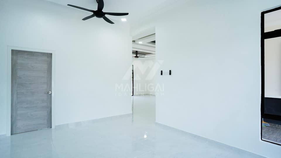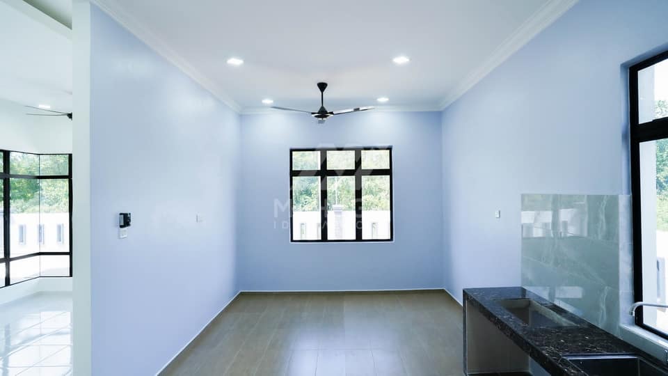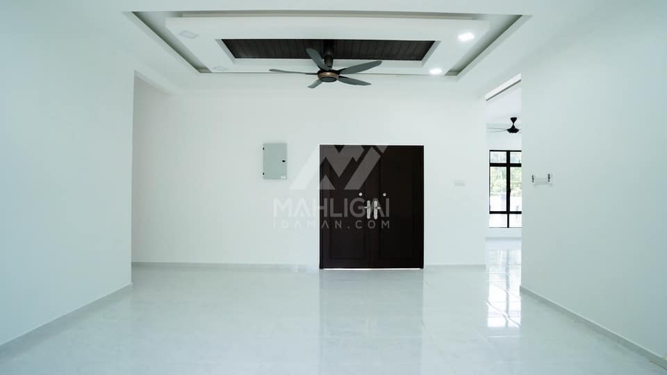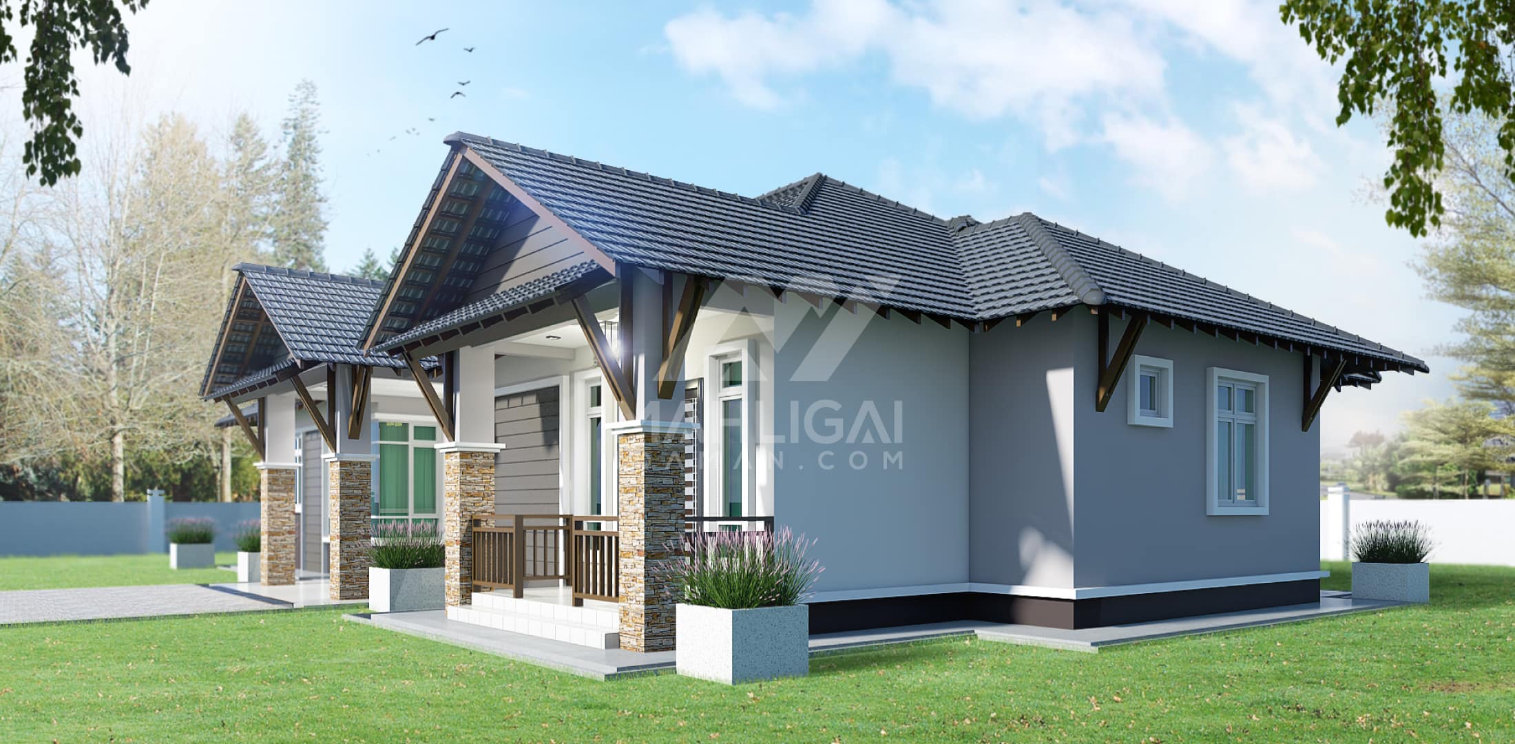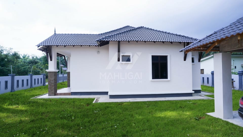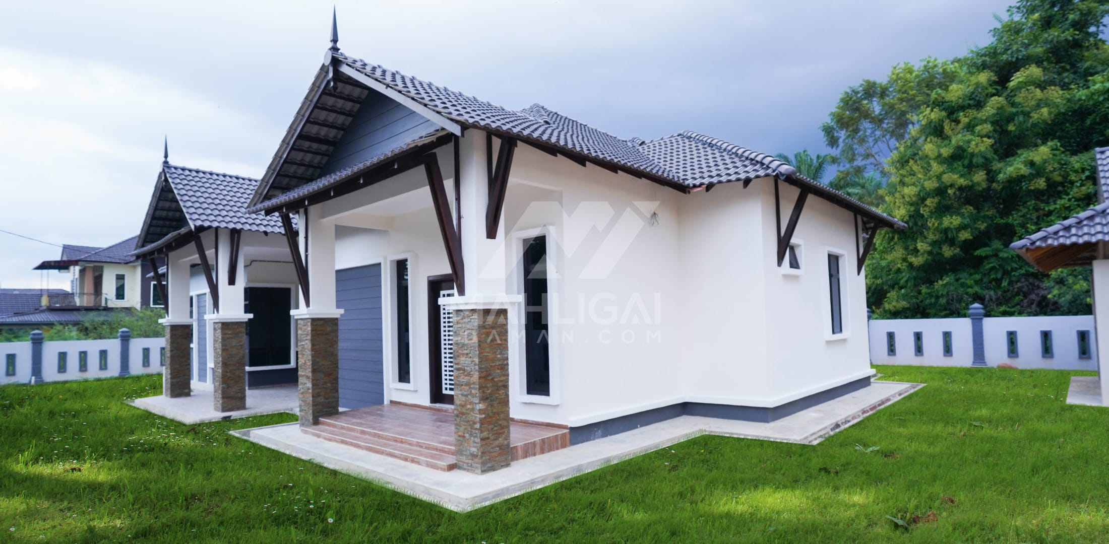Banglo satu tingkat milik klien kami yang telah siap dibina sepenuhnya di Kuala Berang, Terengganu ini mempunyai empat bilik tidur dan tiga bilik air. Banglo ini menggabungkan ciri-ciri banglo moden tradisional seperti penggunaan kayu petunjuk langit di bahagian bumbung serta penggunaan kayu hiasan (tetupang) pada bahagian bumbung rumah. Dari segi penggunaan tona warna pula, pemilik memilih warna putih dan kelabu menaikkan lagi kontra warna tersebut.
