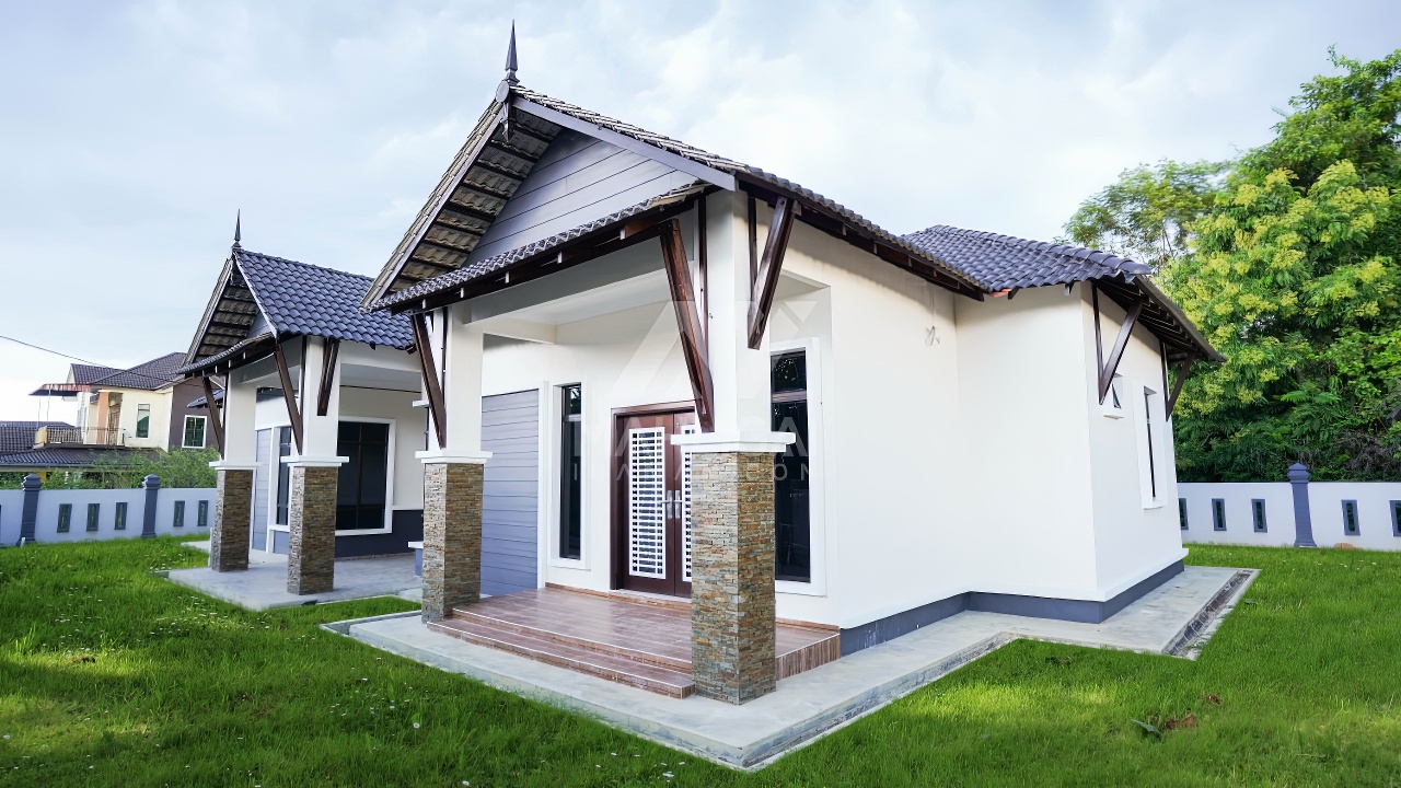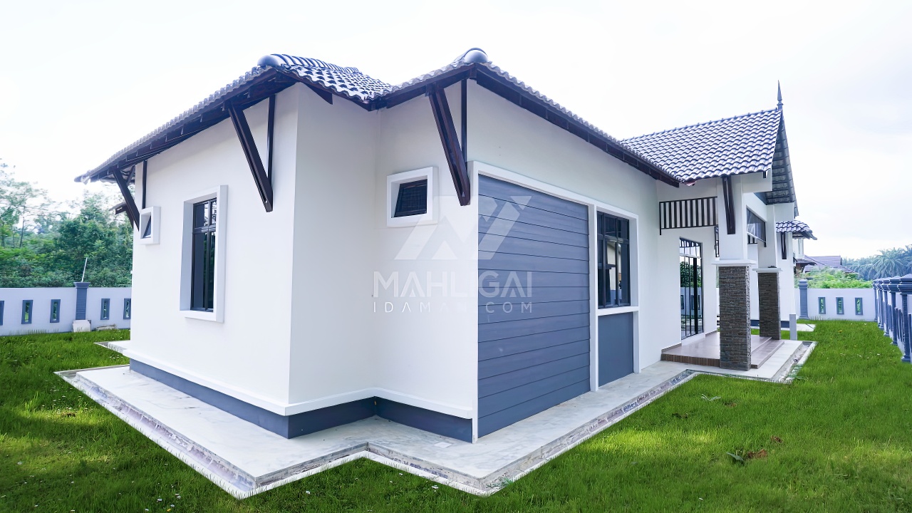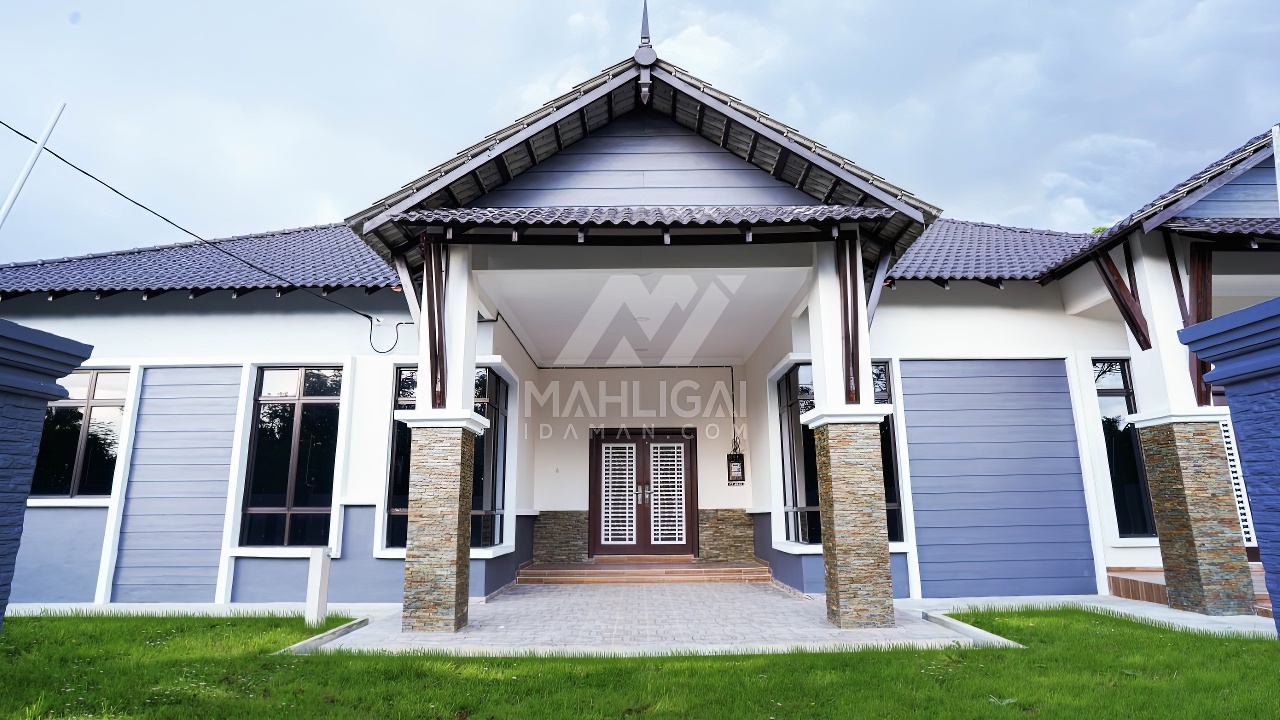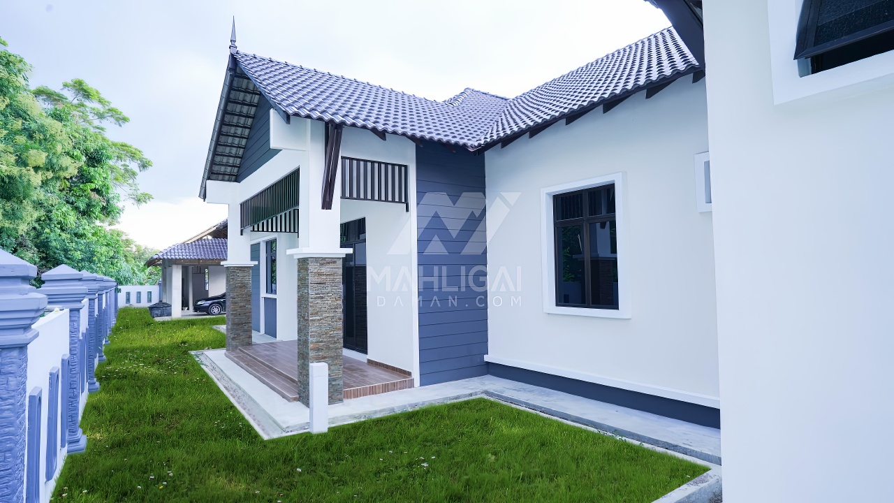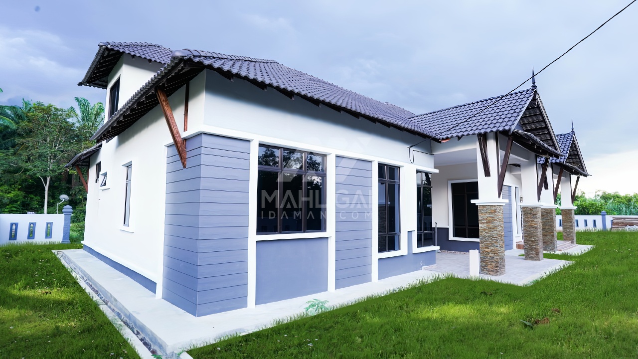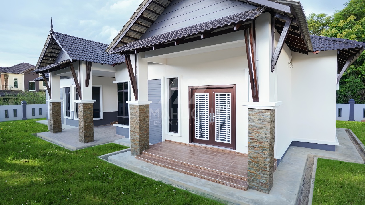 Banglo satu tingkat milik klien kami yang telah siap dibina sepenuhnya di Kuala Berang, Terengganu ini mempunyai empat (4) bilik tidur dan tiga (3) bilik air. Banglo ini menggabungkan ciri-ciri banglo moden tradisional seperti penggunaan kayu petunjuk langit di bahagian bumbung serta penggunaan kayu hiasan tetupang pada bahagian bumbung rumah. Dari segi penggunaan tona warna pula, pemilik memilih warna putih dan kelabu menaikkan lagi kontra warna tersebut.