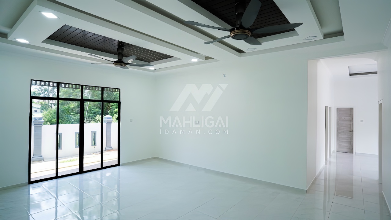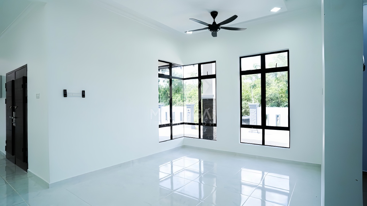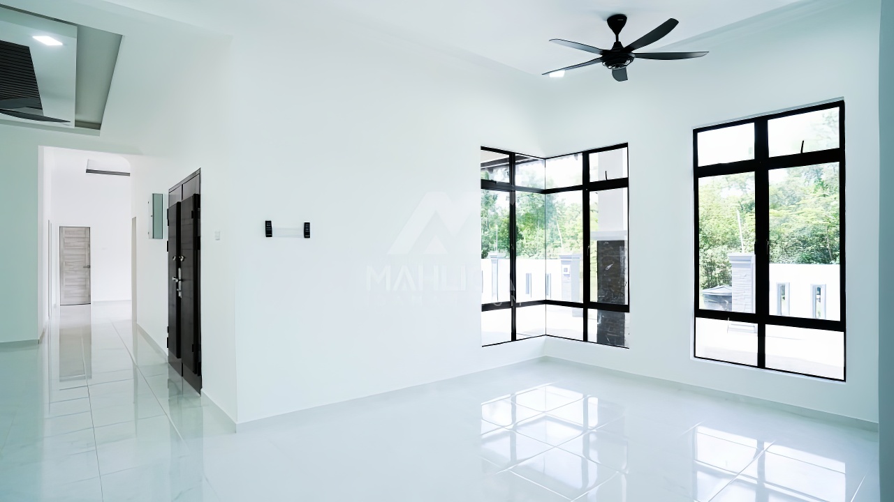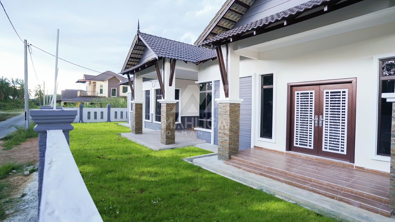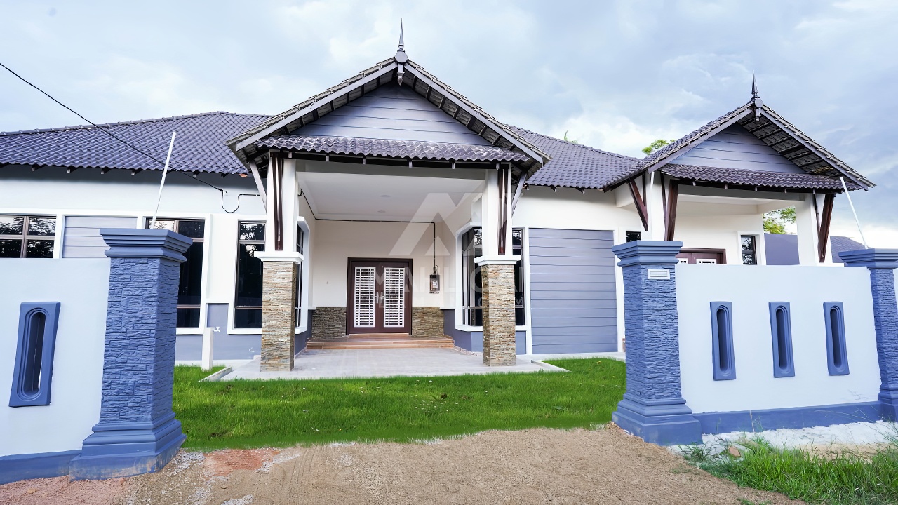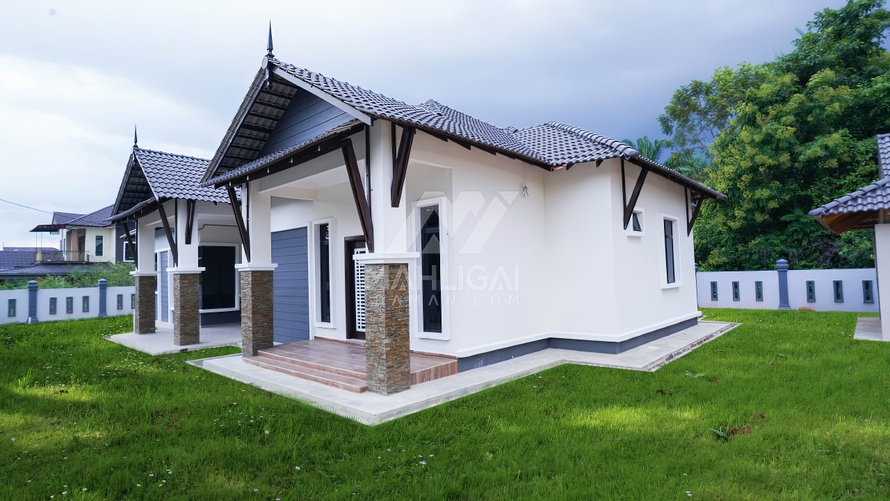 Banglo satu tingkat milik klien kami yang telah siap dibina sepenuhnya di Kuala Berang, Terengganu ini mempunyai empat (4) bilik tidur dan tiga (3) bilik air. Banglo ini menggabungkan ciri-ciri banglo moden tradisional seperti penggunaan kayu petunjuk langit di bahagian bumbung serta penggunaan kayu hiasan tetupang pada bahagian bumbung rumah. Dari segi penggunaan tona warna pula, pemilik memilih warna putih dan kelabu menaikkan lagi kontra warna tersebut.