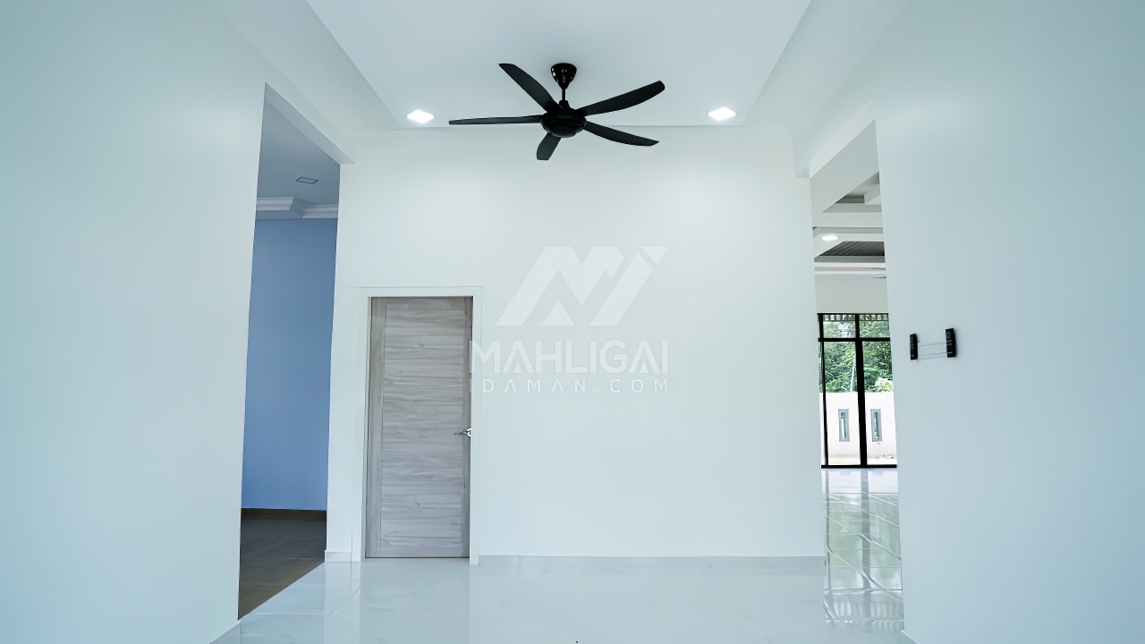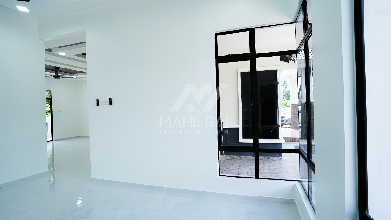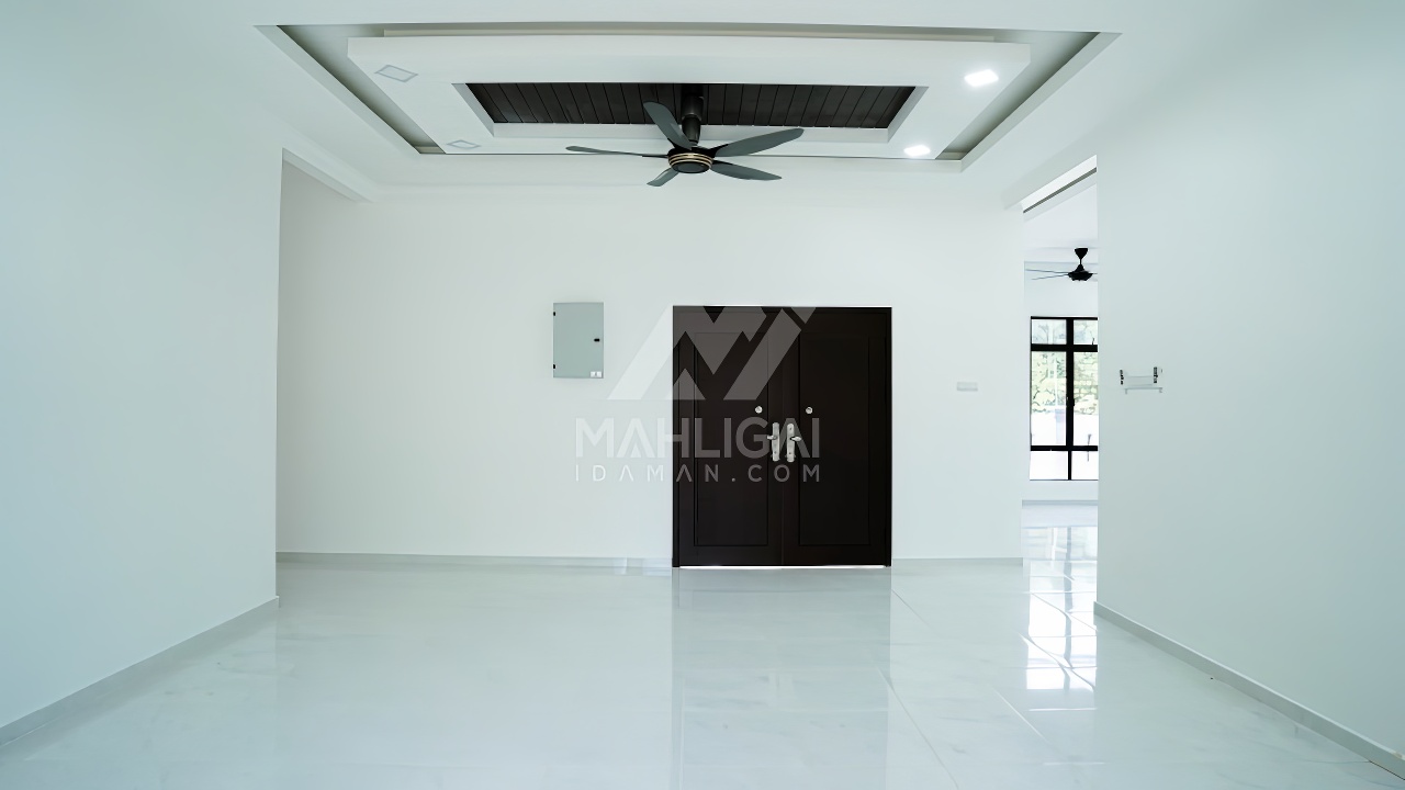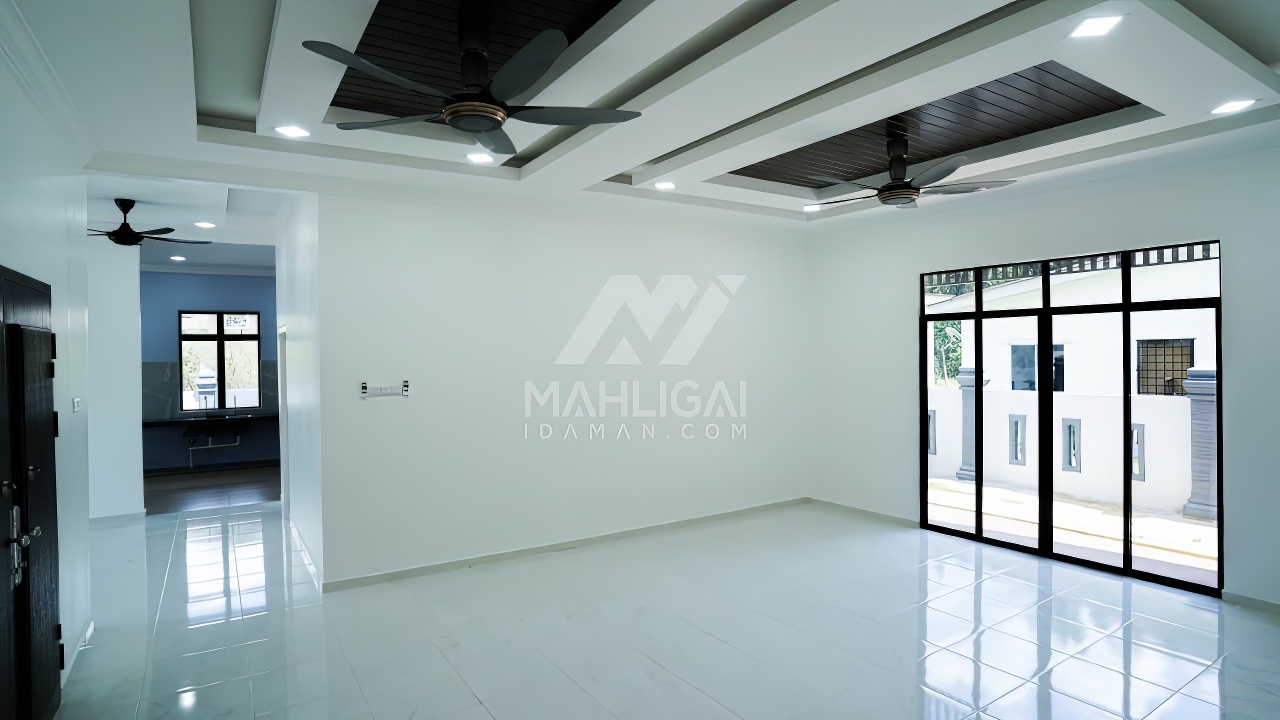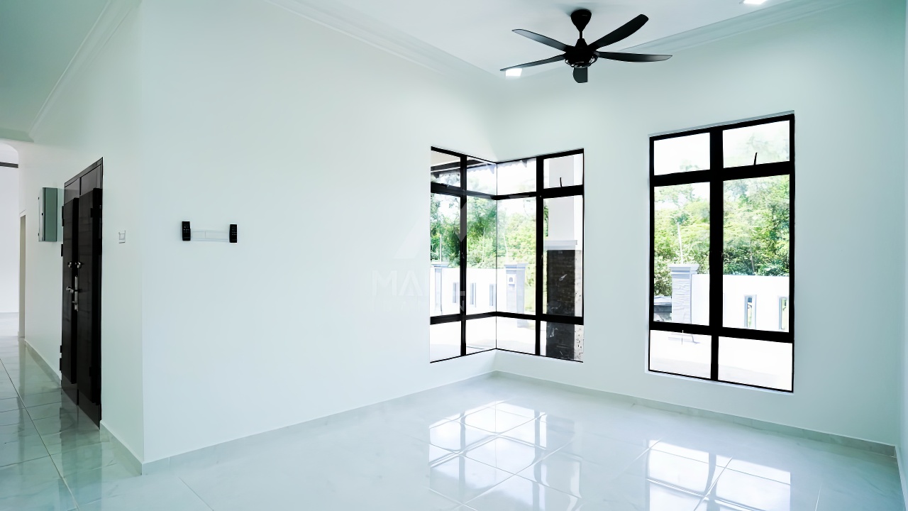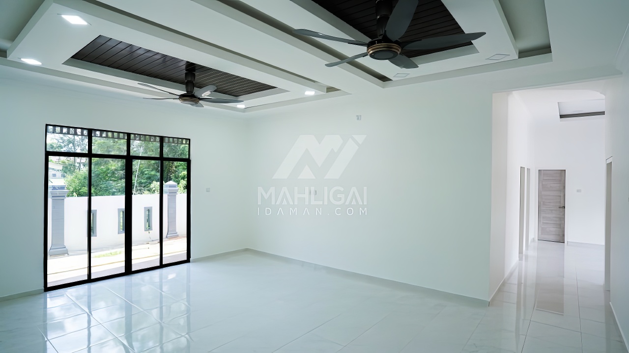 Banglo satu tingkat milik klien kami yang telah siap dibina sepenuhnya di Kuala Berang, Terengganu ini mempunyai empat (4) bilik tidur dan tiga (3) bilik air. Banglo ini menggabungkan ciri-ciri banglo moden tradisional seperti penggunaan kayu petunjuk langit di bahagian bumbung serta penggunaan kayu hiasan tetupang pada bahagian bumbung rumah. Dari segi penggunaan tona warna pula, pemilik memilih warna putih dan kelabu menaikkan lagi kontra warna tersebut.