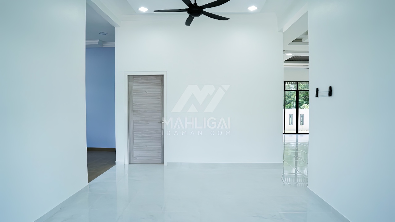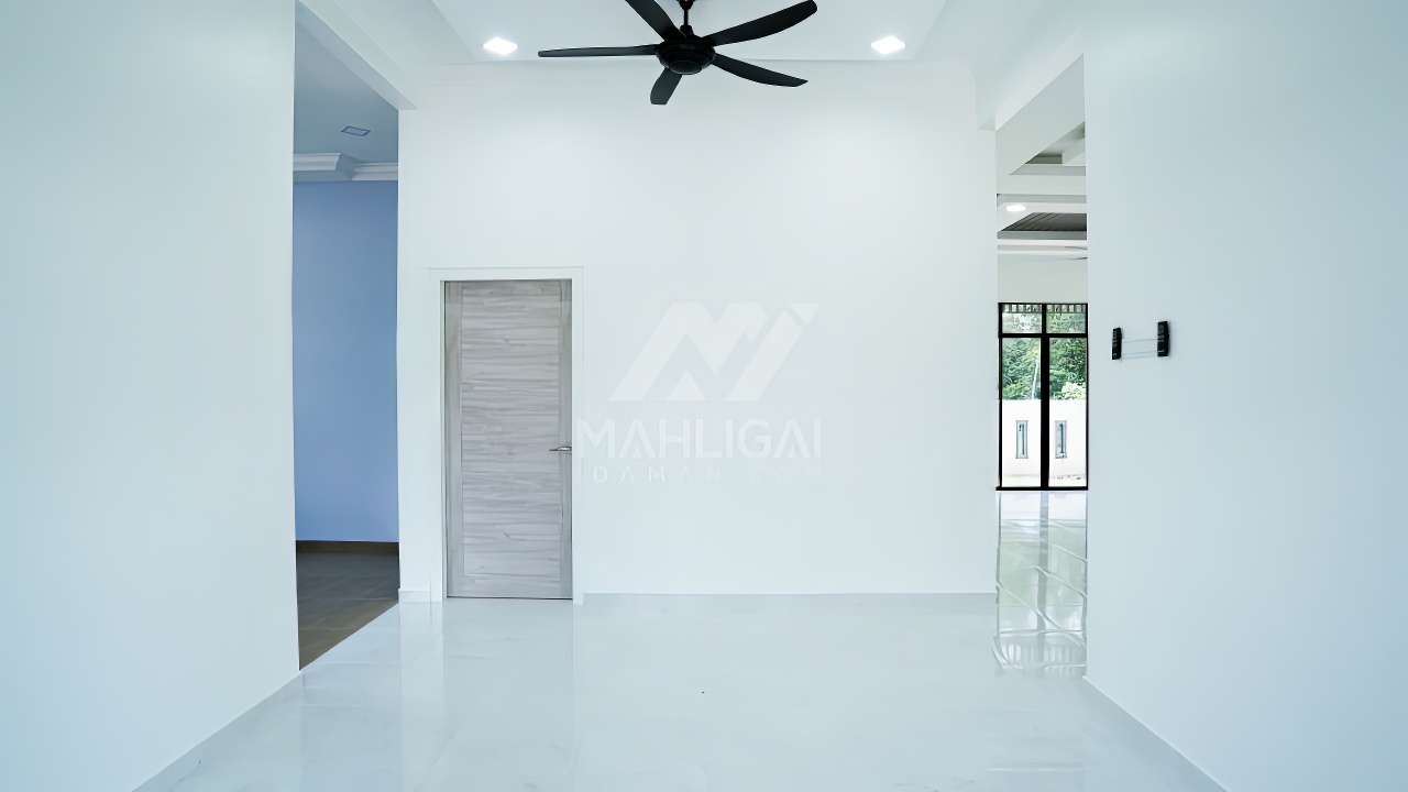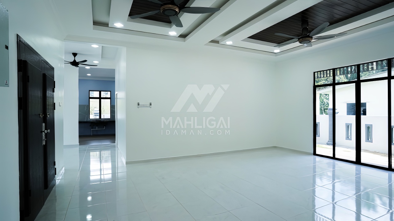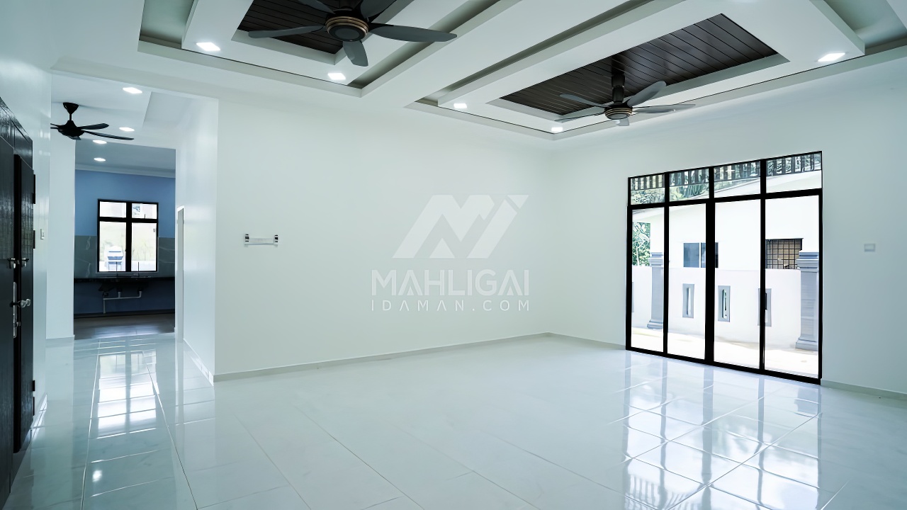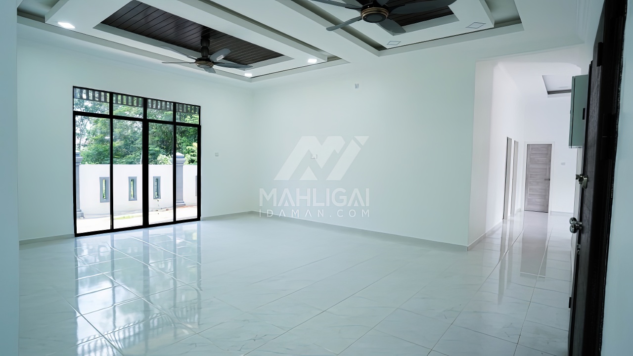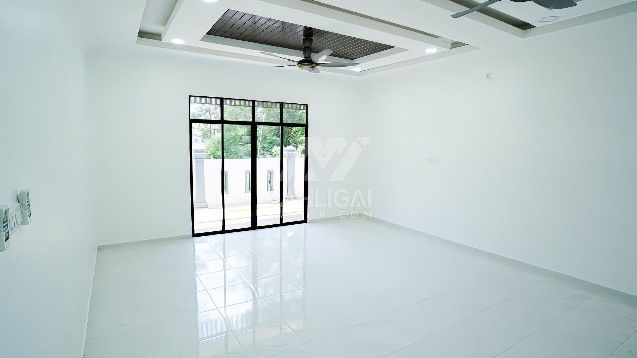 Banglo satu tingkat milik klien kami yang telah siap dibina sepenuhnya di Kuala Berang, Terengganu ini mempunyai empat (4) bilik tidur dan tiga (3) bilik air. Banglo ini menggabungkan ciri-ciri banglo moden tradisional seperti penggunaan kayu petunjuk langit di bahagian bumbung serta penggunaan kayu hiasan tetupang pada bahagian bumbung rumah. Dari segi penggunaan tona warna pula, pemilik memilih warna putih dan kelabu menaikkan lagi kontra warna tersebut.