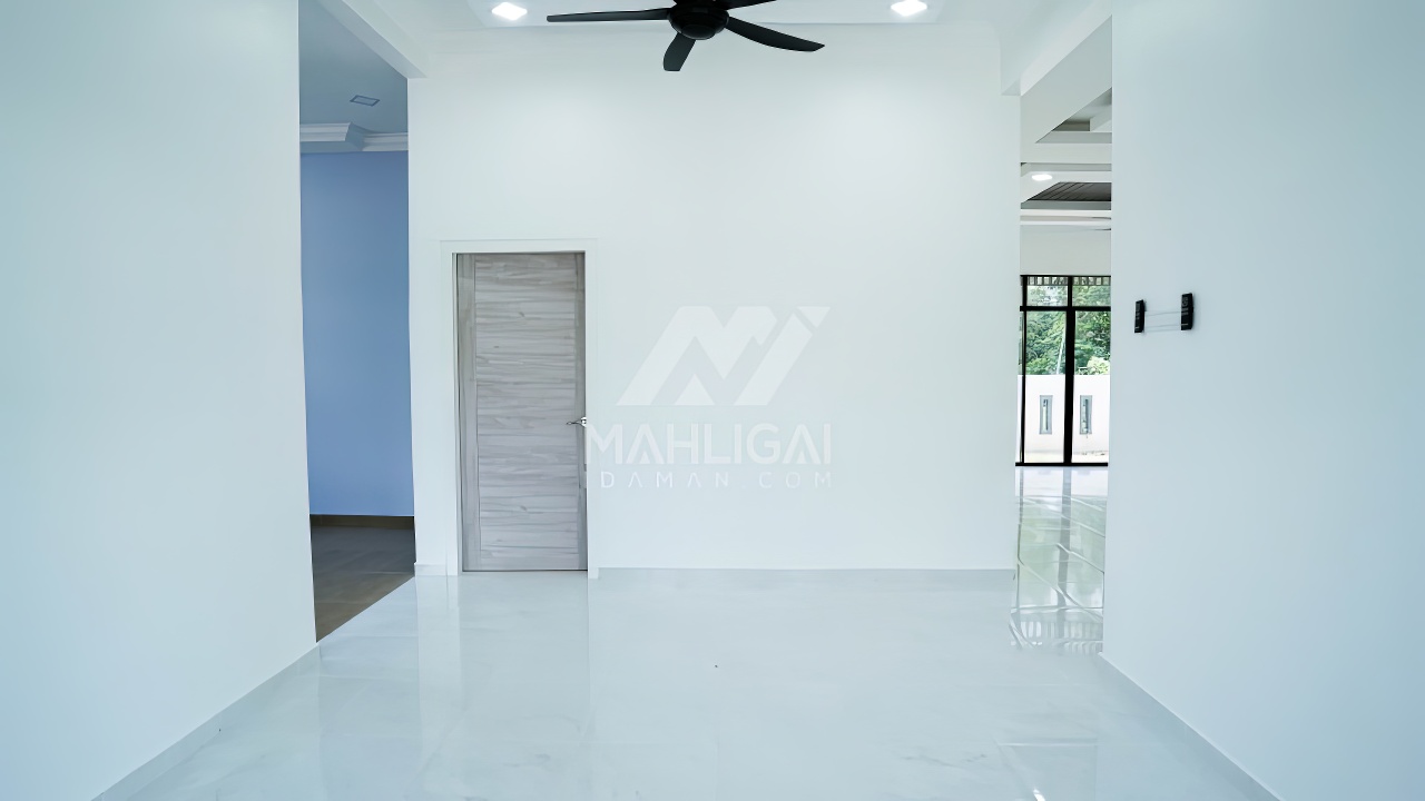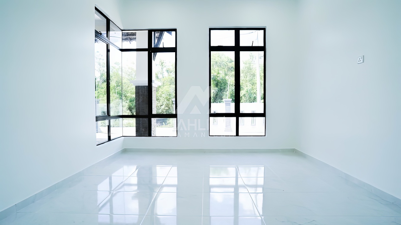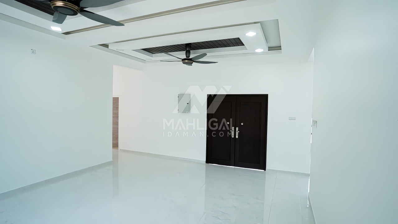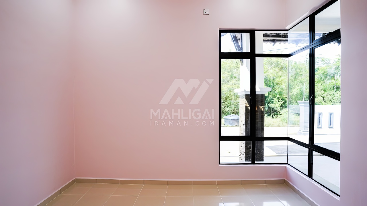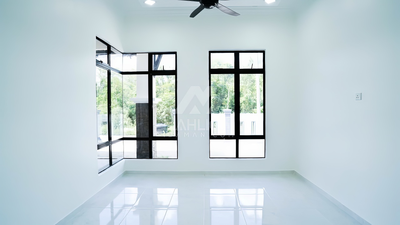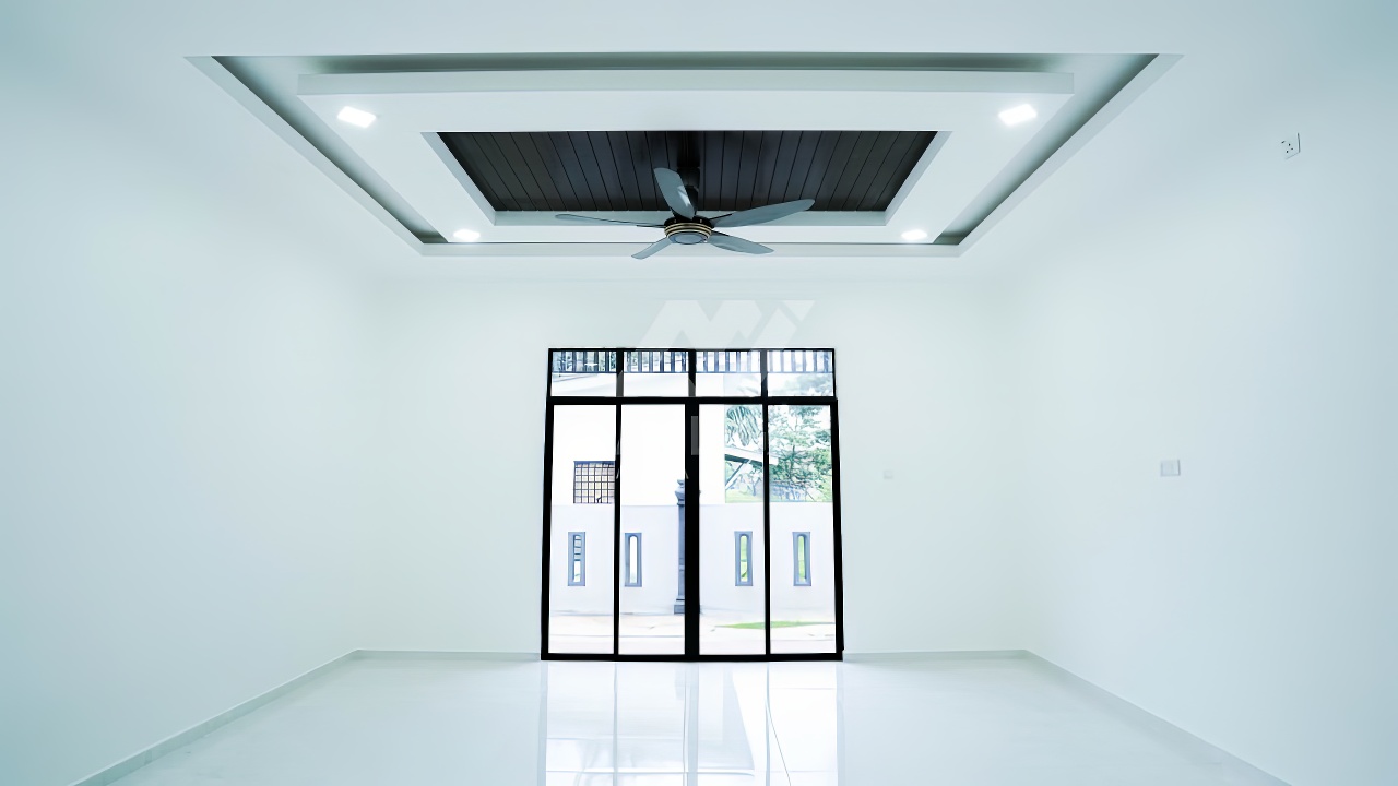 Banglo satu tingkat milik klien kami yang telah siap dibina sepenuhnya di Kuala Berang, Terengganu ini mempunyai empat (4) bilik tidur dan tiga (3) bilik air. Banglo ini menggabungkan ciri-ciri banglo moden tradisional seperti penggunaan kayu petunjuk langit di bahagian bumbung serta penggunaan kayu hiasan tetupang pada bahagian bumbung rumah. Dari segi penggunaan tona warna pula, pemilik memilih warna putih dan kelabu menaikkan lagi kontra warna tersebut.