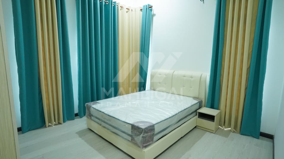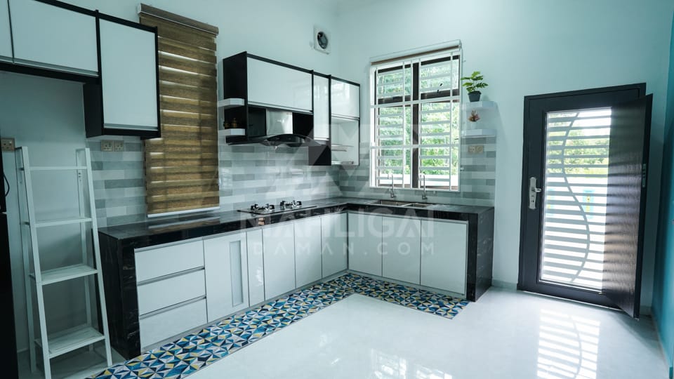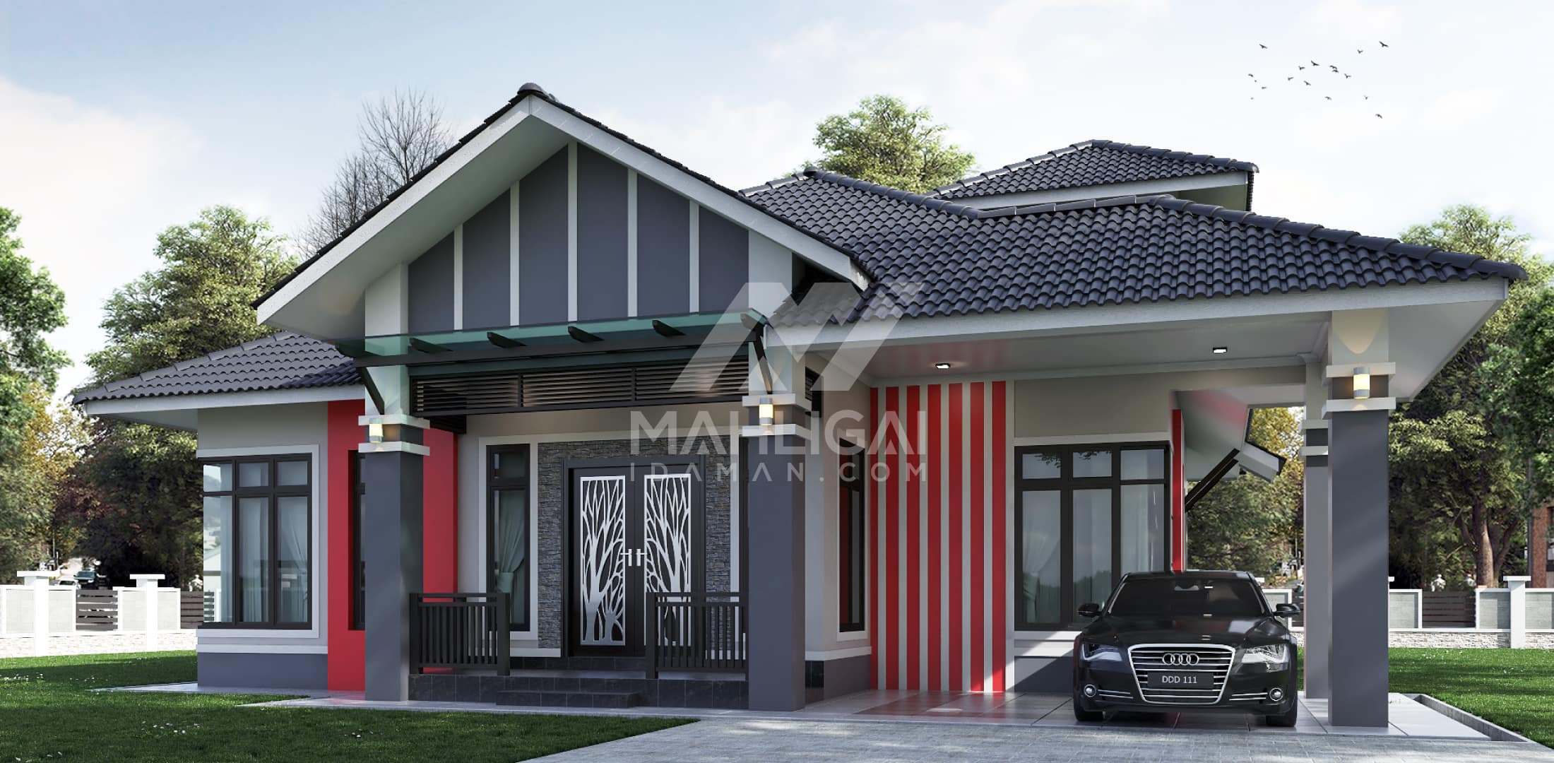 Banglo ini dibina dengan spesifikasi asas Pakej Silver dengan penambahan aksesori iaitu pemasangan cornice pada keseluruhan tingkap luar rumah dan hiasan pada dinding luar rumah bagi menaikan lagi seri rumah.