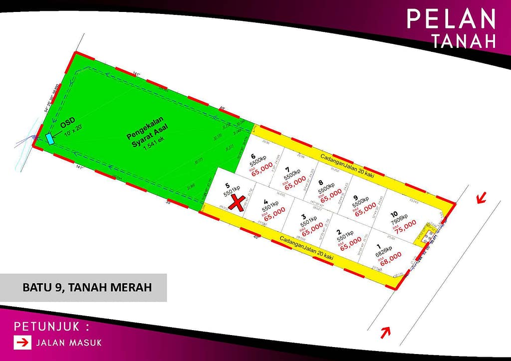 9 lot tanah banglo Batu 9, Tanah Merah ditawarkan dengan pelbagai keluasan. Harga bermula dari RM 65,000 dengan keluasan tanah yang cukup berbaloi dengan harga jualan pasaran semasa. Ini adalah harga hampir separuh lebih rendah dari harga pasaran semasa di kawasan ni. Jimat banyak jika dapatkan segera. Minima saiz tanah 5500 kaki persegi, sangat selesa untuk kediaman masing-masing.