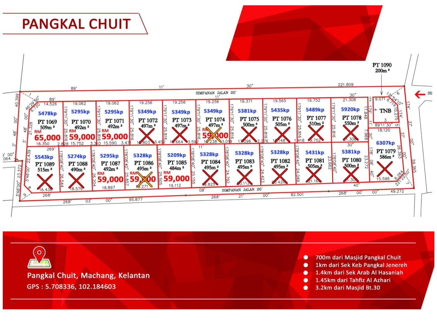 Lokasi tanah yang terletak di Pangkal Chuit, Machang ini merupakan lokasi yang sangat strategik dimana terdapat pelbagai kemudahan asas seperti masjid, sekolah, klinik, Uitm Machang, jalan utama dan sebagainya. Selain daripada kemudahan asas, lokasi tanah Pangkal Chuit, Machang juga merupakan kawasan bebas banjir.
